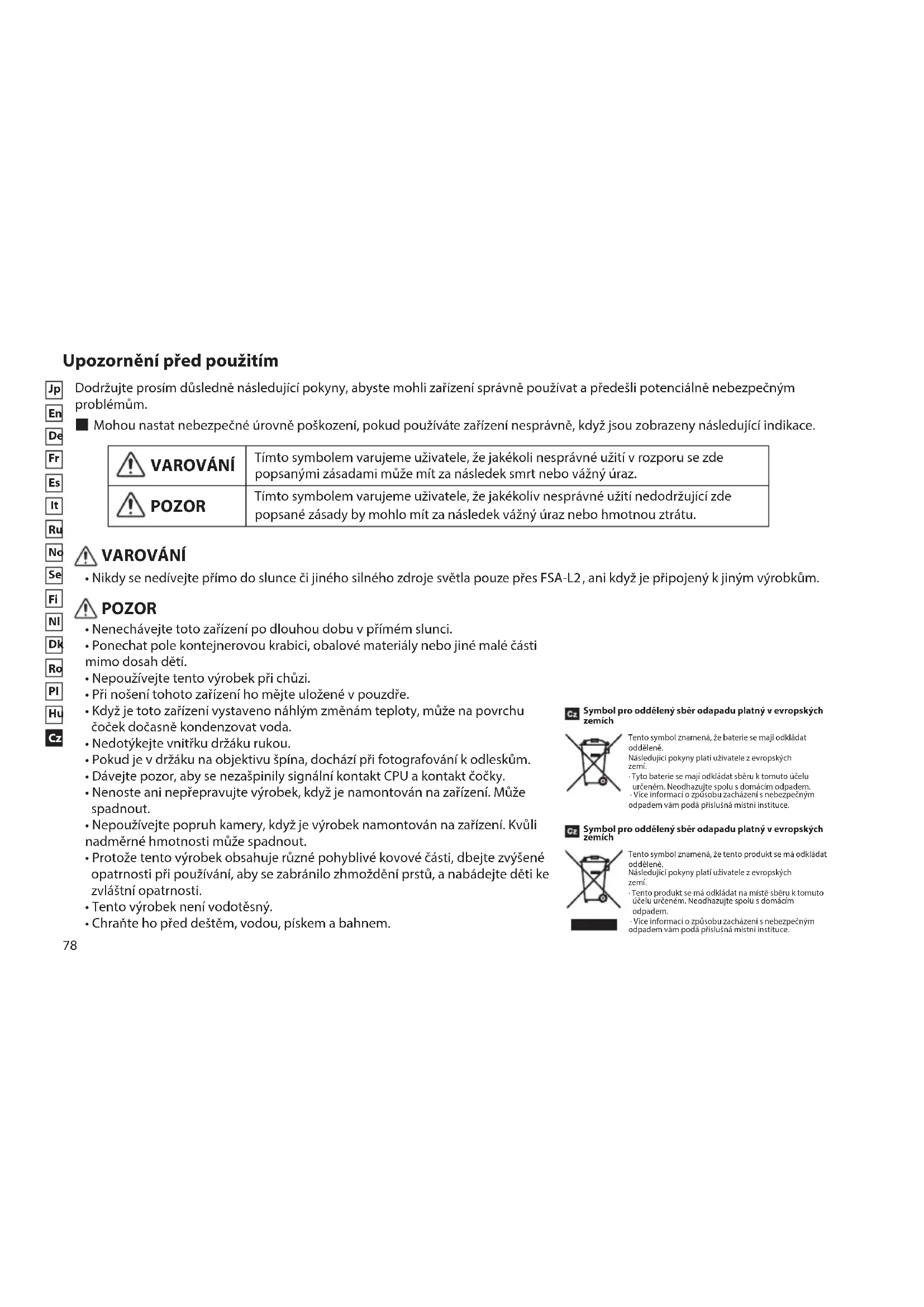 - Nikdy se nedívejte přímo do slunce či jiného silného zdroje světla pouze přes FSA-L2, ani když je připojený k jiným výrobkům. Symbol pro oddělený sběr odapadu platný v evropských zemích Tento symbol znamená, že baterie se mají odkládat odděleně. Následující pokyny platí uživatele z evropských zemí. · Tyto baterie se mají odkládat sběru k tomuto účelu určeném. Neodhazujte spolu s domácím odpadem. · Více informací o způsobu zacházení s nebezpečným odpadem vám podá příslušná místní instituce. Symbol pro oddělený sběr odapadu platný v evropských zemích Tento symbol znamená, že tento produkt se má odkládat odděleně. Následující pokyny platí uživatele z evropských zemí. · Tento produkt se má odkládat na místĕ sbĕru k tomuto účelu určeném. Neodhazujte spolu s domácím odpadem. · Více informací o způsobu zacházení s nebezpečným odpadem vám podá příslušná místní instituce.79