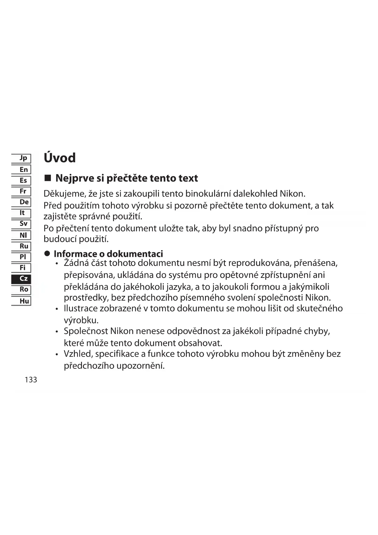 Nejprve si přečtěte tento text Děkujeme, že jste si zakoupili tento binokulární dalekohled Nikon. Před použitím tohoto výrobku si pozorně přečtěte tento dokument, atak zajistěte správné použití. Po přečtení tento dokument uložte tak, aby byl snadno přístupný pro budoucí použití.