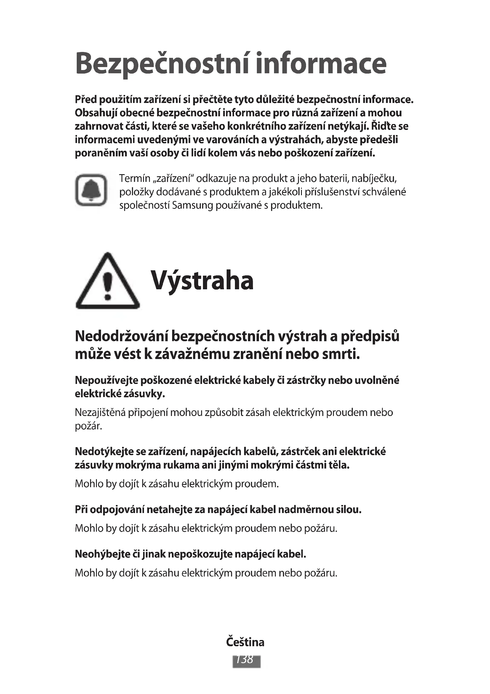 Bezpečnostní informace Před použitím zařízení si přečtěte tyto důležité bezpečnostní informace. Obsahují obecné bezpečnostní informace pro různá zařízení a mohou zahrnovat části, které se vašeho konkrétního zařízení netýkají. Řiďte se informacemi uvedenými ve varováních a výstrahách, abyste předešli poraněním vaší osoby či lidí kolem vás nebo poškození zařízení.Termín „zařízení“ odkazuje na produkt a jeho baterii, nabíječku, položky dodávané s produktem a jakékoli příslušenství schválené společností Samsung používané s produktem. Výstraha Nedodržování bezpečnostních výstrah a předpisů může vést k závažnému zranění nebo smrti. Nepoužívejte poškozené elektrické kabely či zástrčky nebo uvolněné elektrické zásuvky.Nezajištěná připojení mohou způsobit zásah elektrickým proudem nebo požár.Nedotýkejte se zařízení, napájecích kabelů, zástrček ani elektrické zásuvky mokrýma rukama ani jinými mokrými částmi těla.Mohlo by dojít k zásahu elektrickým proudem.Při odpojování netahejte za napájecí kabel nadměrnou silou.Mohlo by dojít k zásahu elektrickým proudem nebo požáru.Neohýbejte či jinak nepoškozujte napájecí kabel.Mohlo by dojít k zásahu elektrickým proudem nebo požáru.Čeština