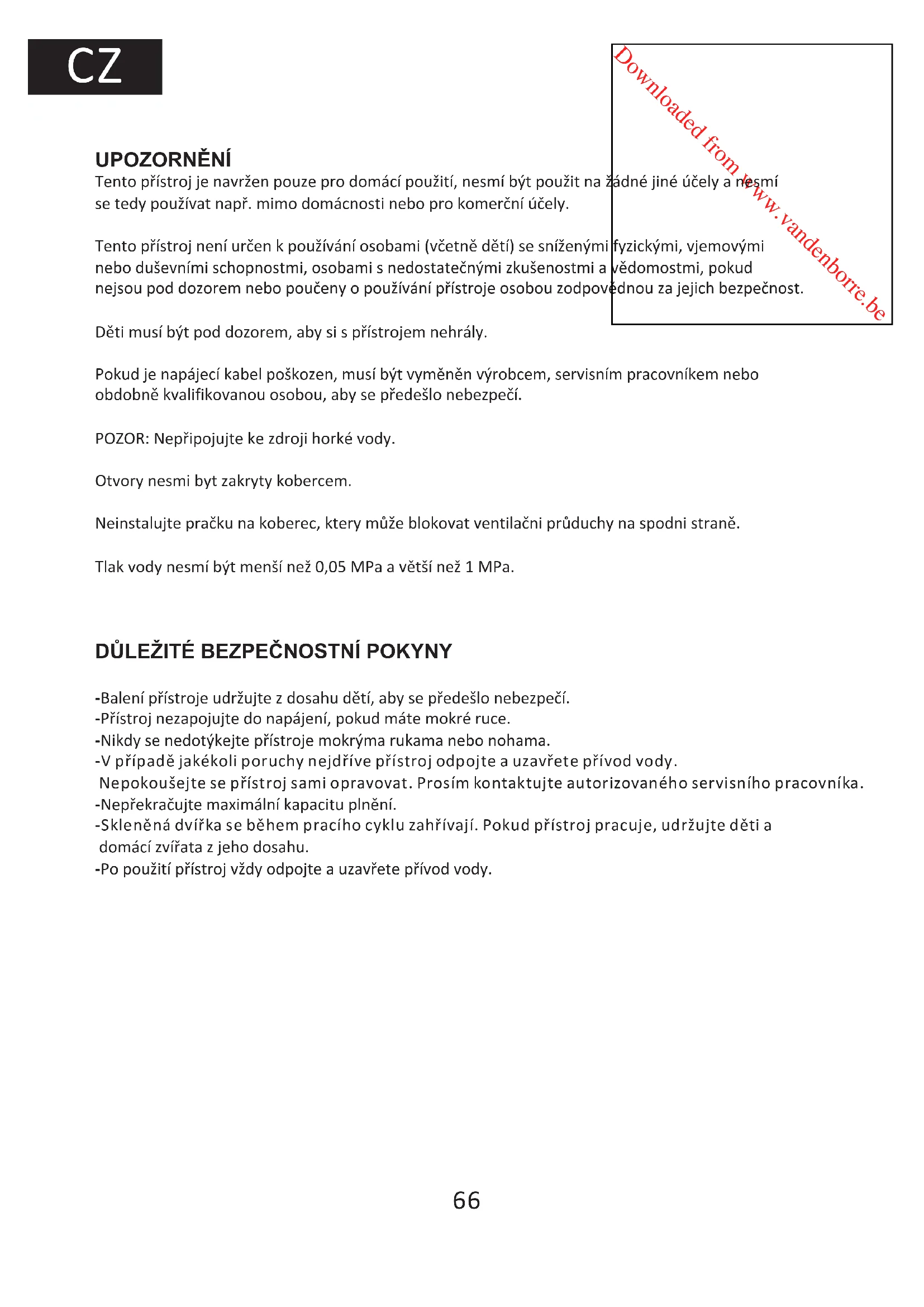78Downloaded from www.vandenborre.be UPOZORNĚNÍ Tento přístroj je navržen pouze pro domácí použití, nesmí být použit na žádné jiné účely a nesmí se tedy používat např. mimo domácnosti nebo pro komerční účely. Tento přístroj není určen k používání osobami (včetně dětí) se sníženými fyzickými, vjemovými nebo duševními schopnostmi, osobami s nedostatečnými zkušenostmi a vědomostmi, pokud nejsou pod dozorem nebo poučeny o používání přístroje osobou zodpovědnou za jejich bezpečnost. Děti musí být pod dozorem, aby si s přístrojem nehrály. Pokud je napájecí kabel poškozen, musí být vyměněn výrobcem, servisním pracovníkem nebo obdobně kvalifikovanou osobou, aby se předešlo nebezpečí. POZOR: Nepřipojujte ke zdroji horké vody. Otvory nesmi byt zakryty kobercem. Neinstalujte pračku na koberec, ktery může blokovat ventilačni průduchy na spodni straně. Tlak vody nesmí být menší než 0,05 MPa a větší než 1 MPa.