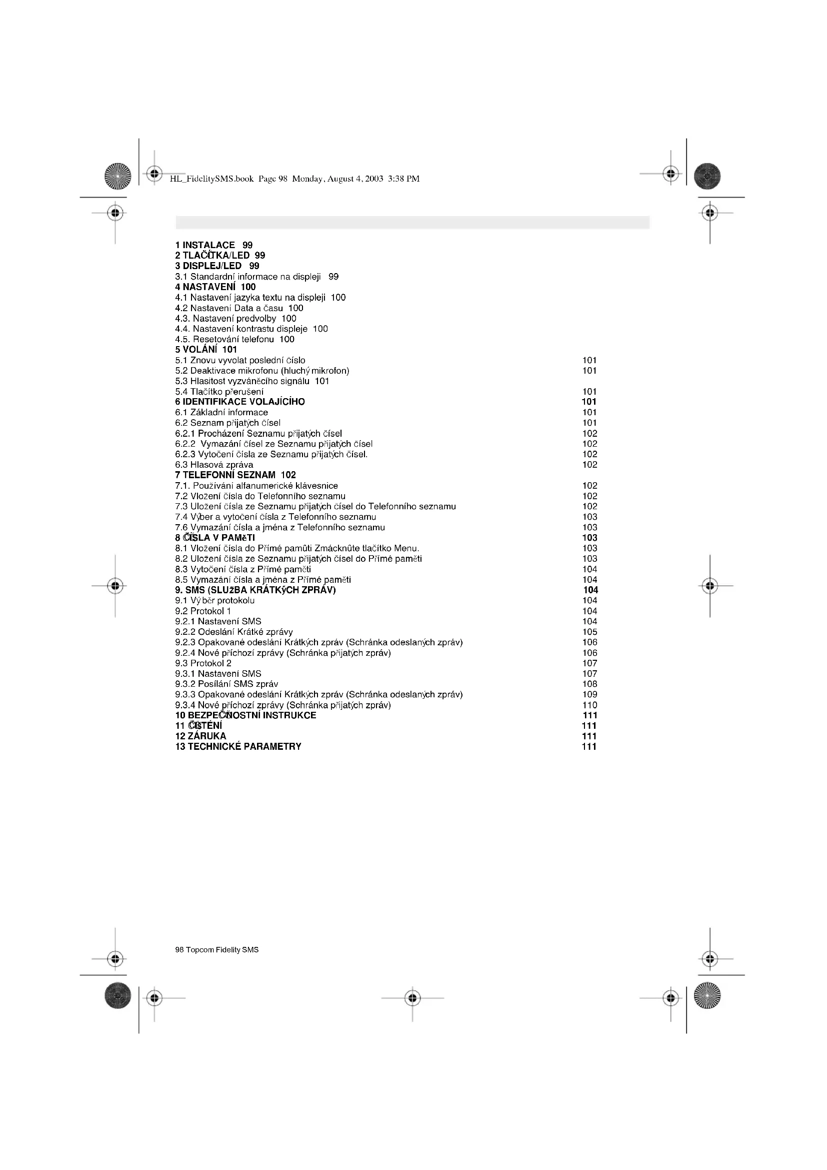 - çíslo. príchozích SMS : KdyΩ vám SMS centrum zasílá novou zprávu, posílá toto telefonní çíslo spoleçn ě se zprávou. Díky této informaci telefon pozná, Ωe jde o príchozí zprávu SMS. HL_FidelitySMS.book Page 107 Monday, August 4, 2003 3:38 PM108 Topcom Fidelity SMS