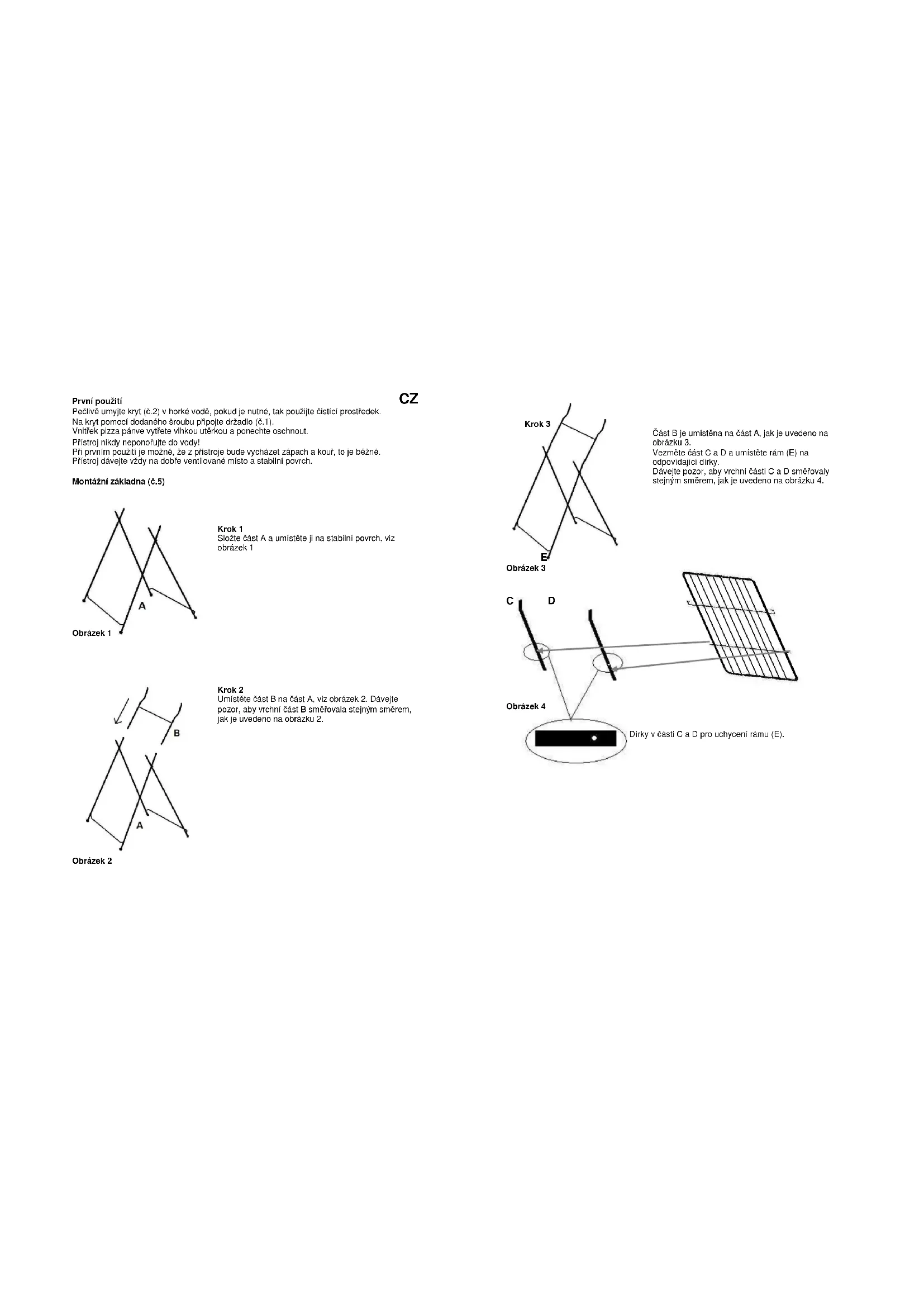Pečlivě umyjte kryt (č.2) v horké vodě, pokud je nutné, tak použijte čistící prostředek. Na kryt pomocí dodaného šroubu připojte držadlo (č.1). Vnitřek pizza pánve vytřete vlhkou utěrkou a ponechte oschnout. Přístroj nikdy neponořujte do vody! Při prvním použití je možné, že z přístroje bude vycházet zápach a kouř, to je běžné. Přístroj dávejte vždy na dobře ventilované místo a stabilní povrch. Montážní základna (č.5)