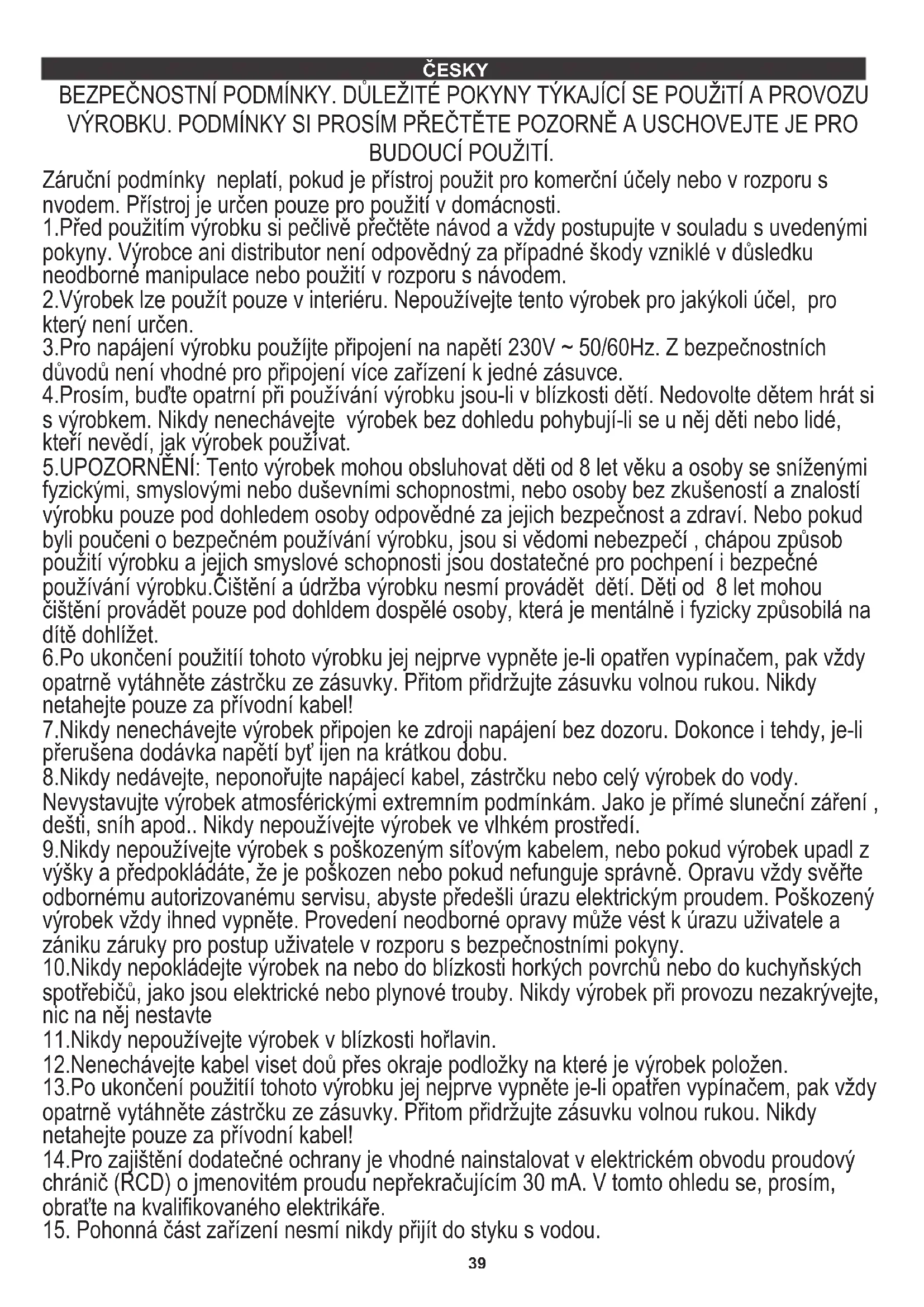 Kompatybilność elektromagnetyczna (EMC) Urządzenie jest wykonane w I klasie izolacji i wymaga uziemienia. Urządzenie jest zgodne z wymaganiami dyrektyw: Urządzenie elektryczne niskonapięciowe (LVD) Wyrób oznaczony CE na tabliczce znamionowej7.Nikdy nenechávejte výrobek připojen ke zdroji napájení bez dozoru. Dokonce i tehdy, je-li přerušena dodávka napětí byť ijen na krátkou dobu. 9.Nikdy nepoužívejte výrobek s poškozeným síťovým kabelem, nebo pokud výrobek upadl z výšky a předpokládáte, že je poškozen nebo pokud nefunguje správně. Opravu vždy svěřte odbornému autorizovanému servisu, abyste předešli úrazu elektrickým proudem. Poškozený výrobek vždy ihned vypněte. Provedení neodborné opravy může vést k úrazu uživatele a zániku záruky pro postup uživatele v rozporu s bezpečnostními pokyny. Záruční podmínky neplatí, pokud je přístroj použit pro komerční účely nebo v rozporu s nvodem. Přístroj je určen pouze pro použití v domácnosti. BEZPEČNOSTNÍ PODMÍNKY. DŮLEŽITÉ POKYNY TÝKAJÍCÍ SE POUŽiTÍ A PROVOZU VÝROBKU. PODMÍNKY SI PROSÍM PŘEČTĚTE POZORNĚ A USCHOVEJTE JE PRO BUDOUCÍ POUŽITÍ. 4.Prosím, buďte opatrní při používání výrobku jsou-li v blízkosti dětí. Nedovolte dětem hrát si s výrobkem. Nikdy nenechávejte výrobek bez dohledu pohybují-li se u něj děti nebo lidé, kteří nevědí, jak výrobek používat. 5.UPOZORNĚNÍ: Tento výrobek mohou obsluhovat děti od 8 let věku a osoby se sníženými fyzickými, smyslovými nebo duševními schopnostmi, nebo osoby bez zkušeností a znalostí výrobku pouze pod dohledem osoby odpovědné za jejich bezpečnost a zdraví. Nebo pokud byli poučeni o bezpečném používání výrobku, jsou si vědomi nebezpečí , chápou způsob použití výrobku a jejich smyslové schopnosti jsou dostatečné pro pochpení i bezpečné používání výrobku.Čištění a údržba výrobku nesmí provádět dětí. Děti od 8 let mohou čištění provádět pouze pod dohldem dospělé osoby, která je mentálně i fyzicky způsobilá na dítě dohlížet. 3.Pro napájení výrobku použíjte připojení na napětí 230V ~ 50/60Hz. Z bezpečnostních důvodů není vhodné pro připojení více zařízení k jedné zásuvce. 2.Výrobek lze použít pouze v interiéru. Nepoužívejte tento výrobek pro jakýkoli účel, pro který není určen. 6.Po ukončení použitíí tohoto výrobku jej nejprve vypněte je-li opatřen vypínačem, pak vždy opatrně vytáhněte zástrčku ze zásuvky. Přitom přidržujte zásuvku volnou rukou. Nikdy netahejte pouze za přívodní kabel! 8.Nikdy nedávejte, neponořujte napájecí kabel, zástrčku nebo celý výrobek do vody. Nevystavujte výrobek atmosférickými extremním podmínkám. Jako je přímé sluneční záření , dešti, sníh apod.. Nikdy nepoužívejte výrobek ve vlhkém prostředí. 11.Nikdy nepoužívejte výrobek v blízkosti hořlavin. 10.Nikdy nepokládejte výrobek na nebo do blízkosti horkých povrchů nebo do kuchyňských spotřebičů, jako jsou elektrické nebo plynové trouby. Nikdy výrobek při provozu nezakrývejte, nic na něj nestavte 1.Před použitím výrobku si pečlivě přečtěte návod a vždy postupujte v souladu s uvedenými pokyny. Výrobce ani distributor není odpovědný za případné škody vzniklé v důsledku neodborné manipulace nebo použití v rozporu s návodem. 12.Nenechávejte kabel viset doů přes okraje podložky na které je výrobek položen. 13.Po ukončení použitíí tohoto výrobku jej nejprve vypněte je-li opatřen vypínačem, pak vždy opatrně vytáhněte zástrčku ze zásuvky. Přitom přidržujte zásuvku volnou rukou. Nikdy netahejte pouze za přívodní kabel! 14.Pro zajištění dodatečné ochrany je vhodné nainstalovat v elektrickém obvodu proudový chránič (RCD) o jmenovitém proudu nepřekračujícím 30 mA. V tomto ohledu se, prosím, obraťte na kvalifikovaného elektrikáře.