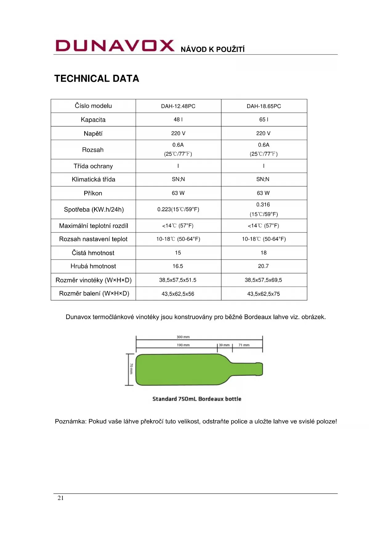 Dunavox termočlánkové vinotéky jsou konstruovány pro běžné Bordeaux lahve viz. obrázek. Poznámka: Pokud vaše láhve překročí tuto velikost, odstraňte police a uložte lahve ve svislé poloze!NÁVOD K POUŽITÍ