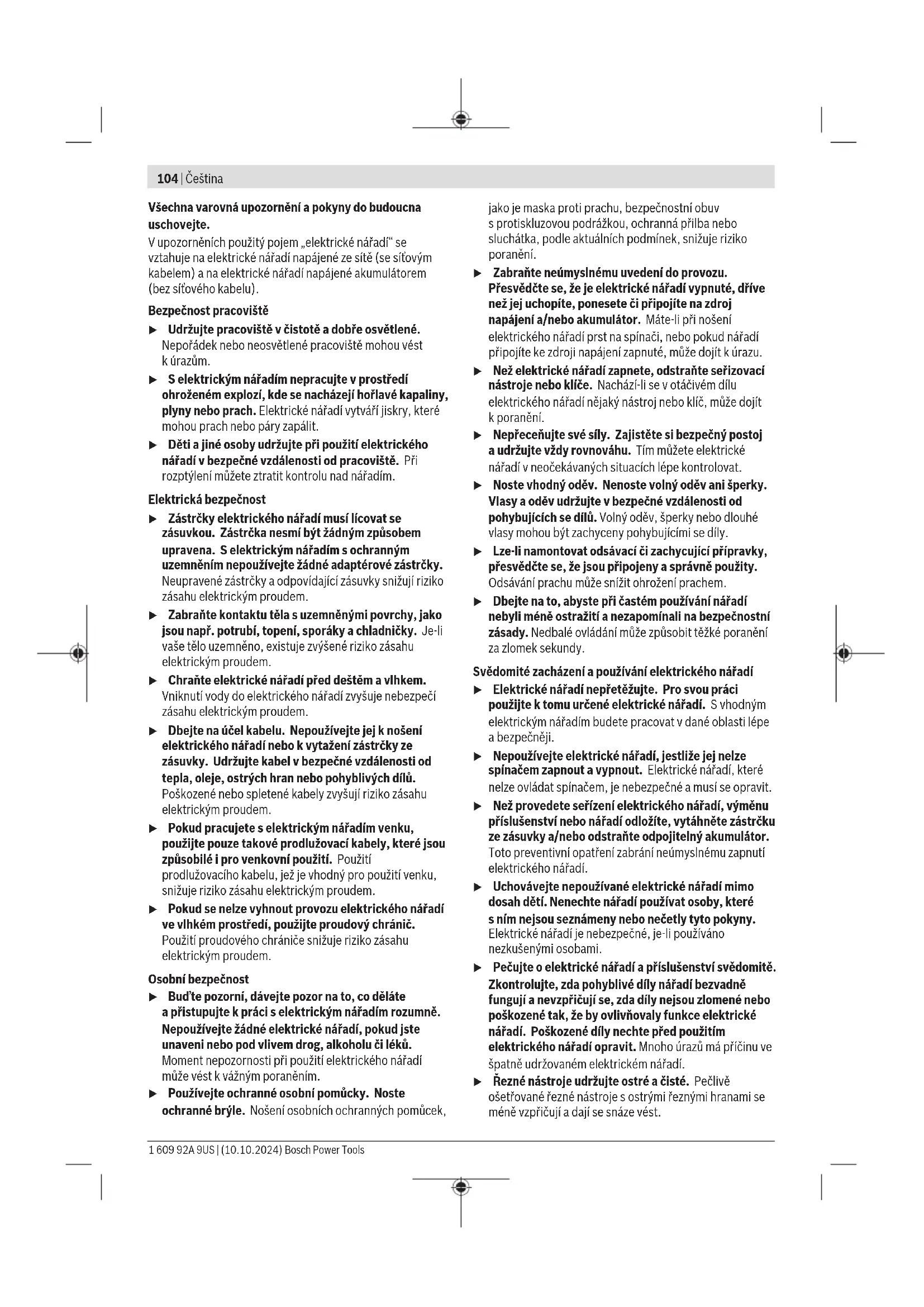 < 2,5 1,5 < 2,5 1,5 Úroveň vibrací aúroveň hluku, které jsou uvedené vtěchto pokynech, byly změřeny pomocí normované měřicí metody alze je použít pro vzájemné porovnání elektronářadí. Hodí se ipro předběžný odhad zatížení vibracemi ahlukem. Uvedená úroveň vibrací aúroveň hluku reprezentuje hlavní použití elektronářadí. Pokud se ovšem bude elektronářadí používat pro jiné práce, sjinými nástroji nebo snedostatečnou údržbou, může se úroveň hluku aúroveň vibrací lišit. To může zatížení vibracemi ahlukem po celou pracovní dobu zřetelně zvýšit. Pro přesný odhad zatížení vibracemi ahlukem by měly být zohledněny idoby, kdy je nářadí vypnuté nebo běží, ale ve skutečnosti se nepoužívá. To může zatížení vibracemi ahlukem po celou pracovní dobu výrazně snížit. Stanovte dodatečná bezpečnostní opatření kochraně obsluhy před účinky vibrací, jako je např. údržba elektronářadí anástrojů, udržování teplých rukou, organizace pracovních procesů. Akumulátor Bosch prodává akumulátorové elektrické nářadí ibez akumulátoru. Na obale je uvedené, zda je součástí dodávky elektrického nářadí akumulátor. Nabíjení akumulátoru u Používejte pouze nabíječky uvedené vtechnických údajích. Jen tyto nabíječky jsou přizpůsobené pro lithium-iontový akumulátor používaný svaším elektronářadím. Upozornění: Lithium-iontové akumulátory se na základě mezinárodních dopravních předpisů dodávají částečně nabité. Aby byl zaručen plný výkon akumulátoru, před prvním použitím akumulátor úplně nabijte. Nasazení akumulátoru Vložte nabitý akumulátor do uchycení akumulátoru tak, aby citelně zaskočil. Bosch Power Tools 1 609 92A 9US | (10.10.2024)108 | Čeština Vyjmutí akumulátoru Pro vyjmutí akumulátoru stiskněte odjišťovací tlačítka avytáhněte akumulátor. Nepoužívejte přitom násilí. Ukazatel stavu nabití akumulátoru Ukazatel stavu nabití akumulátoru ukáže při napůl stisknutém vypínači na několik sekund stav nabití akumulátoru. LED Kapacita Trvale svítí 3 zelené 60–100% Trvale svítí 2 zelené 30–60% Trvale svítí 1 zelená 5–30% Bliká 1 zelená 0–5% Ochrana proti přetížení závislá na teplotě Pokud se nářadí používá vsouladu surčeným účelem, nemůže dojít kjeho přetížení. Při příliš velkém zatížení nebo mimo přípustný teplotní rozsah akumulátoru se sníží otáčky nebo se elektronářadí vypne. Vpřípadě snížení otáček se elektronářadí rozběhne znovu na plné otáčky až po dosažení přípustné teploty akumulátoru nebo po omezení zatížení. Vpřípadě automatického vypnutí elektronářadí vypněte, nechte akumulátor vychladnout aelektronářadí znovu zapněte. Upozornění pro optimální zacházení s akumulátorem Akumulátor chraňte před vlhkostí a vodou. Akumulátor skladujte pouze v teplotním rozmezí od −20 °C do 50 °C. Nenechávejte akumulátor ležet např. v létě v autě. Výrazně kratší doba chodu po nabití ukazuje, že je akumulátor opotřebovaný a musí se vyměnit. Dodržujte pokyny pro likvidaci. Montáž u Před každou prací na elektrickém nářadí (např. údržba, výměna nástroje atd.) zněj vyjměte akumulátor. Při neúmyslném stisknutí vypínače hrozí nebezpečí poranění. Výměna nástroje Nasazení nástroje (viz obrázek A) Nasaďte nástroj až na doraz do upínání nástroje (1). Montáž nástavce (viz obrázek B) Vyjměte nástroj. Nasaďte nástavec do upínání nástroje (1). Otočte aretační kroužek (14) tak, aby slyšitelně zaskočil. Nasazení nástroje do nástavce GFA 12-W (viz obrázek A) Nasaďte nástroj až na doraz do upínání nástroje (1). GFA12-E, GFA12-X (viz obrázekC) Posuňte zajišťovací objímku dozadu, nasaďte nástroj až na doraz do upínání nástroje(1) azajišťovací objímku opět uvolněte, aby se nástroj zaaretoval. GFA12-B (vizobrázekD) Povolte sklíčidlo(11) otáčením ve směru➊ tak, aby bylo možné nasadit nástroj. Nasaďte nástroj. Rukou silně utáhněte objímku sklíčidla(11) ve směru➋. Sklíčidlo se tím automaticky zajistí. Pro uvolnění zajištění avyjmutí nástroje povolte objímku sklíčidla ve směru otáčení. Otočení nástavce GFA12-E, GFA12-W (vizobrázekE) Zatáhněte nástavec dopředu. Otočte nástavec. Nástavec zaskočí v16 polohách vrozsahu 360°. Zvolte polohu, která je vhodná pro příslušnou práci. Znovu uvolněte nástavec, aby se zaaretoval. Demontáž nástavce (viz obrázek F) Vyjměte nástroj. Odjistěte nástavec ve směru astáhněte ho zupínání nástroje (1). Kombinace nástavců Pravoúhlý nástavec(13) lze kombinovat se všemi ostatními nástavci. Za tím účelem nasaďte pravoúhlý nástavec(13) do upínání nástroje(1). Otočte aretační kroužek(14) tak, aby slyšitelně zaskočil. Poté nasaďte další nástavec na pravoúhlý nástavec(13). Odsávání prachu/třísek Prach zmateriálů, jako jsou nátěry sobsahem olova, některé druhy dřeva, minerály akov, může být zdraví škodlivý. Kontakt sprachem nebo vdechnutí mohou upracovníka nebo osob nacházejících se vblízkosti vyvolat alergické reakce a/nebo onemocnění dýchacích cest. Určitý prach, jako dubový nebo bukový prach, je pokládán za karcinogenní, zvláště ve spojení spřídavnými látkami pro ošetření dřeva (chromát, ochranné prostředky na dřevo). Materiál obsahující azbest smějí opracovávat pouze specialisté. – Pokud možno používejte pro daný materiál vhodné odsávání prachu. – Zajistěte dobré větrání pracoviště. – Je doporučeno nosit ochrannou dýchací masku střídou filtruP2. Dodržujte předpisy pro obráběné materiály platné vpříslušné zemi. u Zabraňte hromadění prachu na pracovišti. Prach se může lehce 