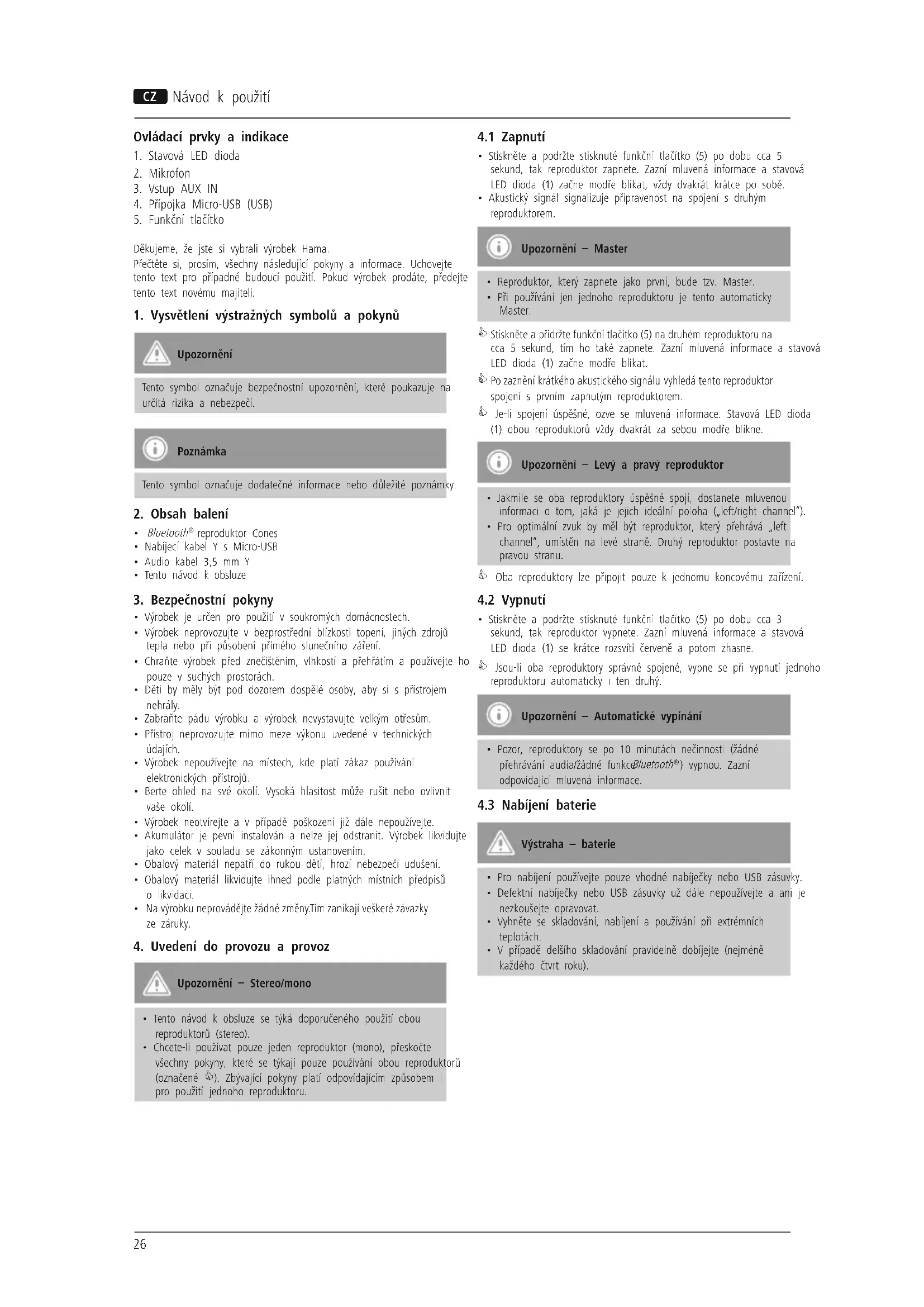 reproduktor Cones• Nabíjecí kabel Y s Micro-USB• Audio kabel 3,5 mm Y• Tento návod k obsluze