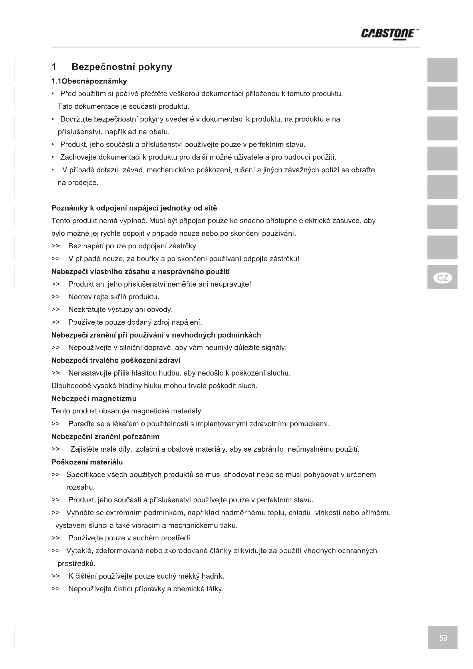 - Vpřípadědotazů,závad,mechanickéhopoškození,rušeníajinýchzávažnýchpotížíseobraťte naprodejce. Poznámkykodpojenínapájecíjednotkyodsítě Tentoproduktnemávypínač.Musíbýtpřipojenpouzekesnadnopřístupnéelektrickézásuvce,aby bylomožnéjejrychleodpojitvpřípaděnouzeneboposkončenípoužívání. >> Beznapětípouzepoodpojenízástrčky. >> Vpřípaděnouze,zabouřkyaposkončenípoužíváníodpojtezástrčku! Nebezpečívlastníhozásahuanesprávnéhopoužití >> Produktanijehopříslušenstvíneměňteanineupravujte! >> Neotevírejteskříňproduktu. >> Nezkratujtevýstupyaniobvody. >> Používejtepouzedodanýzdrojnapájení. Nebezpečízraněnípřipoužívánívnevhodnýchpodmínkách >> Nepoužívejtevsilničnídopravě,abyvámneuniklydůležitésignály. Nebezpečítrvaléhopoškozenízdraví >> Nenastavujtepřílišhlasitouhudbu,abynedošlokpoškozenísluchu. Dlouhodoběvysokéhladinyhlukumohoutrvalepoškoditsluch. Nebezpečímagnetizmu Tentoproduktobsahujemagnetickémateriály. >> Poraďteseslékařemopoužitelnostisimplantovanýmizdravotnímipomůckami. Nebezpečnízraněnípořezáním >> Zajistětemalédíly,izolačníaobalovémateriály,abysezabrániloneúmyslnémupoužití. Poškozenímateriálu >> Specikacevšechpoužitýchproduktůsemusíshodovatnebosemusípohybovatvurčeném rozsahu. >> Produkt,jehosoučástiapříslušenstvípoužívejtepouzevperfektnímstavu. >> Vyhněteseextrémnímpodmínkám,napříkladnadměrnémuteplu,chladu,vlhkostinebopřímému vystavení slunci a také vibracím a mechanickému tlaku. >> Používejtepouzevsuchémprostředí. >> Vyteklé,zdeformovanénebozkorodovanéčlánkyzlikvidujtezapoužitívhodnýchochranných prostředků. >> Kčištěnípoužívejtepouzesuchýměkkýhadřík. >> Nepoužívejtečistícípřípravkyachemickélátky.Uživatelská příručka