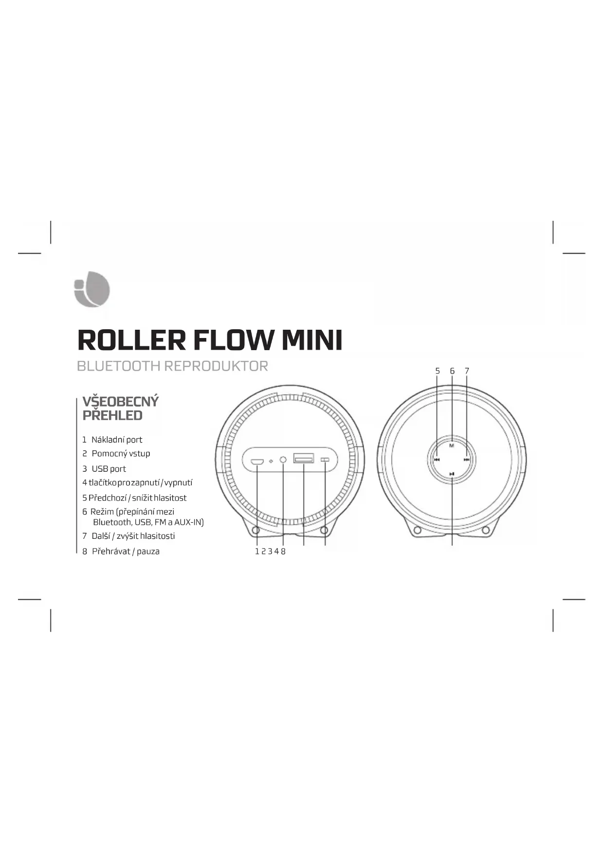 BEPALINGEN VAN RICHTLIJN 1999/5/CE. Batterij garantie. De batterij is een verbruiksartikel en als zodanig bedraagt de garantie 12 maanden.roller flow mINI Bluetooth reproduktor VŠEOBECNÝ PŘEHLED 1 Nákladní port 2 Pomocný vstup 3 USB port 4 tlačítko pro zapnutí / vypnutí 5 Předchozí / snížit hlasitost 6 Režim (přepínání mezi Bluetooth, USB, FM a AUX-IN) 7 Další / zvýšit hlasitosti 8 Přehrávat / pauza