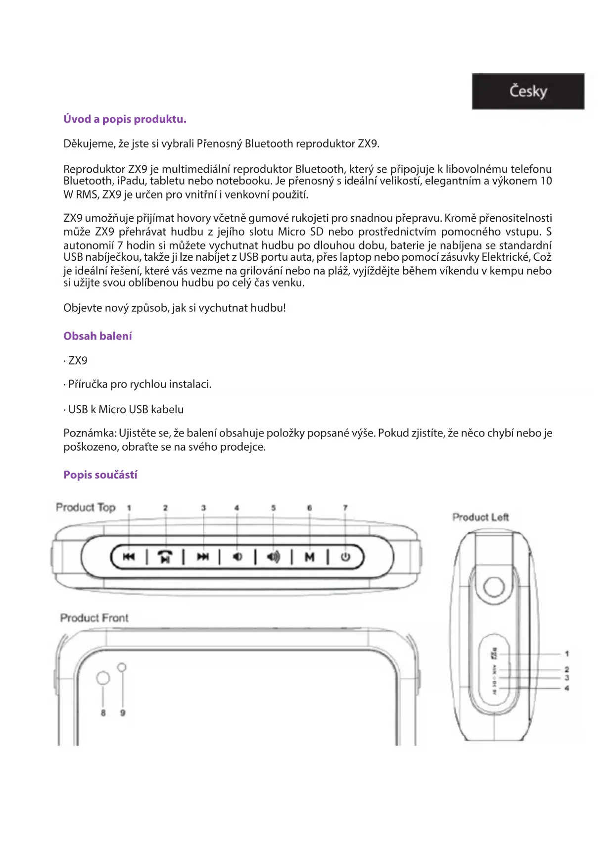 акумулатора и периодичните заряди. Техническа поддръжка: Моля, посетете нашия уеб сайт www.billowtechnology.com за повече информация относно инсталирането и конфигурирането на този продукт.Úvod a popis produktu. Děkujeme, že jste si vybrali Přenosný Bluetooth reproduktor ZX9. Reproduktor ZX9 je multimediální reproduktor Bluetooth, který se připojuje k libovolnému telefonu Bluetooth, iPadu, tabletu nebo notebooku. Je přenosný s ideální velikostí, elegantním a výkonem 10 W RMS, ZX9 je určen pro vnitřní i venkovní použití. ZX9 umožňuje přijímat hovory včetně gumové rukojeti pro snadnou přepravu. Kromě přenositelnosti může ZX9 přehrávat hudbu z jejího slotu Micro SD nebo prostřednictvím pomocného vstupu. S autonomií 7 hodin si můžete vychutnat hudbu po dlouhou dobu, baterie je nabíjena se standardní USB nabíječkou, takže ji lze nabíjet z USB portu auta, přes laptop nebo pomocí zásuvky Elektrické, Což je ideální řešení, které vás vezme na grilování nebo na pláž, vyjíždějte během víkendu v kempu nebo si užijte svou oblíbenou hudbu po celý čas venku. Objevte nový způsob, jak si vychutnat hudbu! Obsah balení