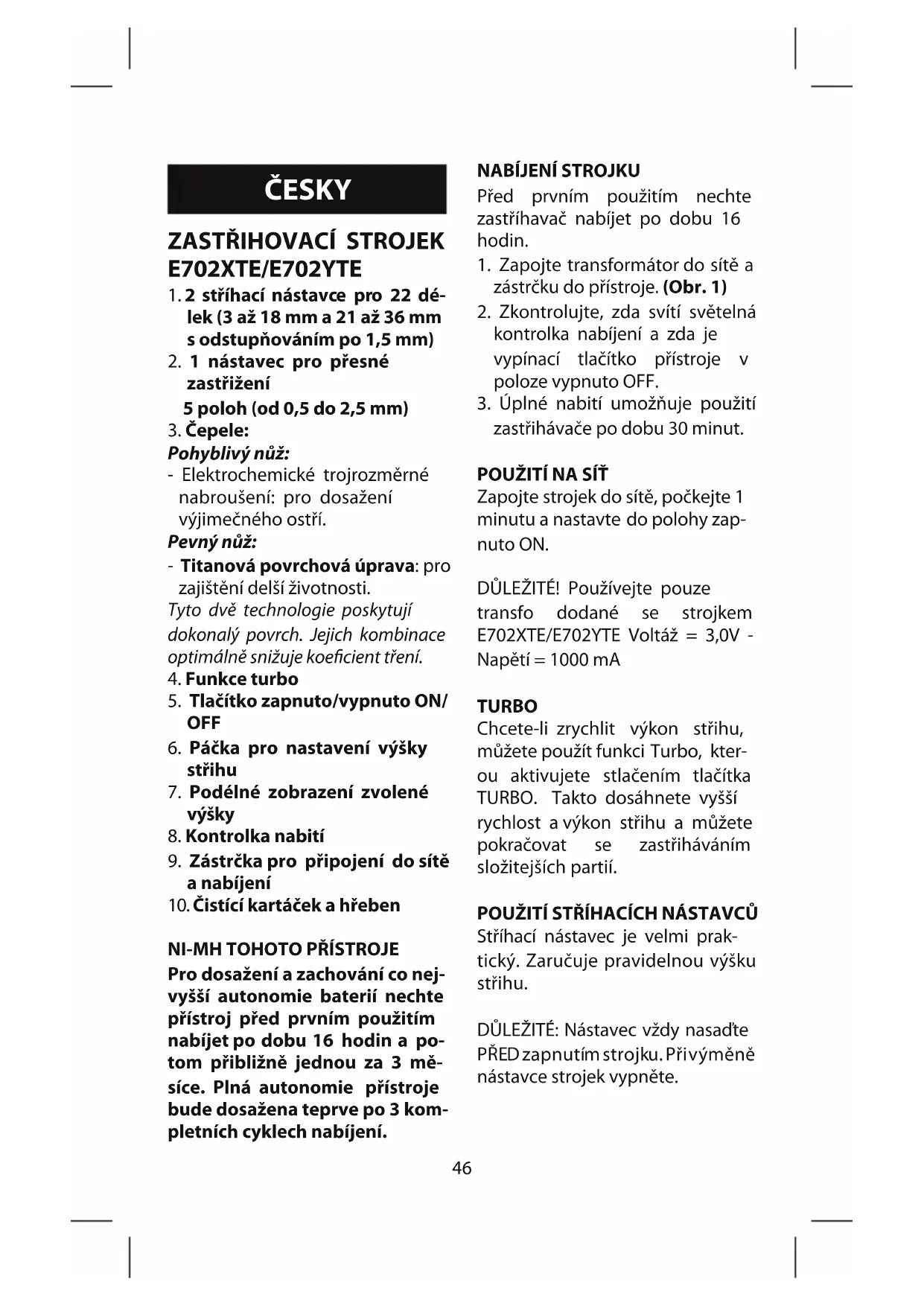 Zapojte strojek do sítě, počkejte 1 minutu a nastavte do polohy zap- nuto ON. DŮLEŽITÉ! Používejte pouze transfo dodané se strojkem E702XTE/E702YTE Voltáž = 3,0V - Napětí = 1000 mA TURBO Chcete-li zrychlit výkon střihu, můžete použít funkci Turbo, kter- ou aktivujete stlačením tlačítka TURBO. Takto dosáhnete vyšší rychlost a výkon střihu a můžete pokračovat se zastřiháváním složitejších partií. POUŽITÍ STŘÍHACÍCH NÁSTAVCŮ Stříhací nástavec je velmi prak- tický. Zaručuje pravidelnou výšku střihu. DŮLEŽITÉ: Nástavec vždy nasaďte P Ř ED z a p n u t ím s t r o j ku . P ř i v ý m ě n ě nástavce strojek vypněte.47 Při umístění stříhacího nástavce nejprve nastavte výšku střihu na 3 mm nebo 21 mm a umístěte nástavec na držák. Nejdříve nas- tavte na obou stranách dle značek a potom spodní část nástavce zatlačte dovnitř. (Obr. 2) Při sejmutí stříhacího nástavce nejprve nastavte výšku střihu na 3 mm nebo 21 mm a uvolněte nástavec z držáku, palcem zatlačte na jeho spodní část. (Obr. 3) UPOZORNĚNÍ! Nástavec pro přesné stříhání se nasazuje stejně jako stříhací nástavec, ale nasta- vuje se ručně a nezávisle na nasta- vující páčce. UVEDENÍ DO cHODU A pOUŽITÍ Pro nastavení výšky zastřižení použijte nastavující páčku (6), kterou posunete směrem nahoru nebo směrem dolů. Zvolená výška se zobrazí na pravé a levé straně přístroje: Stiskněte tlačítko ON/OFF. Výšku střihu můžete kdykoliv změnit. Díky systému SMART ADJUSTING SYSTEM je zvolená výška střihu za- je zvolená výška střihu za- chována, ať je úhel sklonu strojku jakýkoliv. To zaručuje provedení přesného střihu. TEcHNIKY STŘIHU A RADY OD- BORNÍKA
