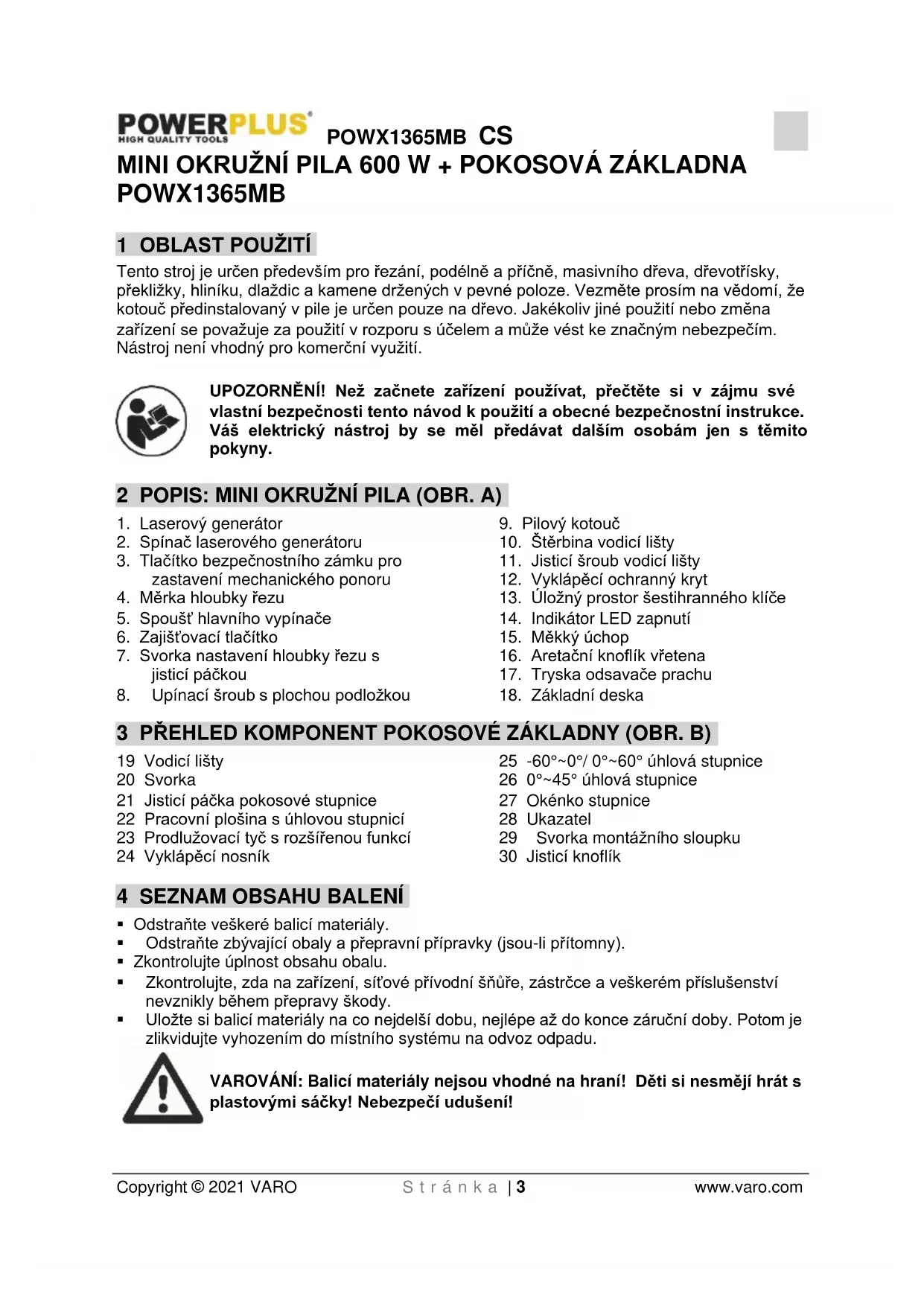 Odstraňte veškeré balicí materiály. Odstraňte zbývající obaly a přepravní přípravky (jsou-li přítomny). Zkontrolujte úplnost obsahu obalu. Zkontrolujte, zda na zařízení, síťové přívodní šňůře, zástrčce a veškerém příslušenství nevznikly během přepravy škody. Uložte si balicí materiály na co nejdelší dobu, nejlépe až do konce záruční doby. Potom je zlikvidujte vyhozením do místního systému na odvoz odpadu. VAROVÁNÍ: Balicí materiály nejsou vhodné na hraní! Děti si nesmějí hrát s plastovými sáčky! Nebezpečí udušení!POWX1365MB CS Copyright © 2021 VARO S t r á n k a | 4 www.varo.com 1x nástroj 1x návod k použití 1x pilový kotouč s tvrzeným kovovým ozubením (A): vhodný pro: měkké dřevo, tvrdé dřevo, desky všech typů 1x diamantový pilový kotouč (D): vhodný pro: keramiku, dlaždice 1x pilový kotouč HSS (E): vhodný pro: měkký kov, hliník 1x hadice odsávání prachu (B) 1x klíč s vnitřním šestihranem (F) 1x vodicí opěrka (G) 1x pokosová základna Jestliže některé díly chybí nebo jsou poškozeny, obraťte se na svého obchodníka. 5 SYMBOLY V této příručce a/nebo na stroji se používají následující symboly: