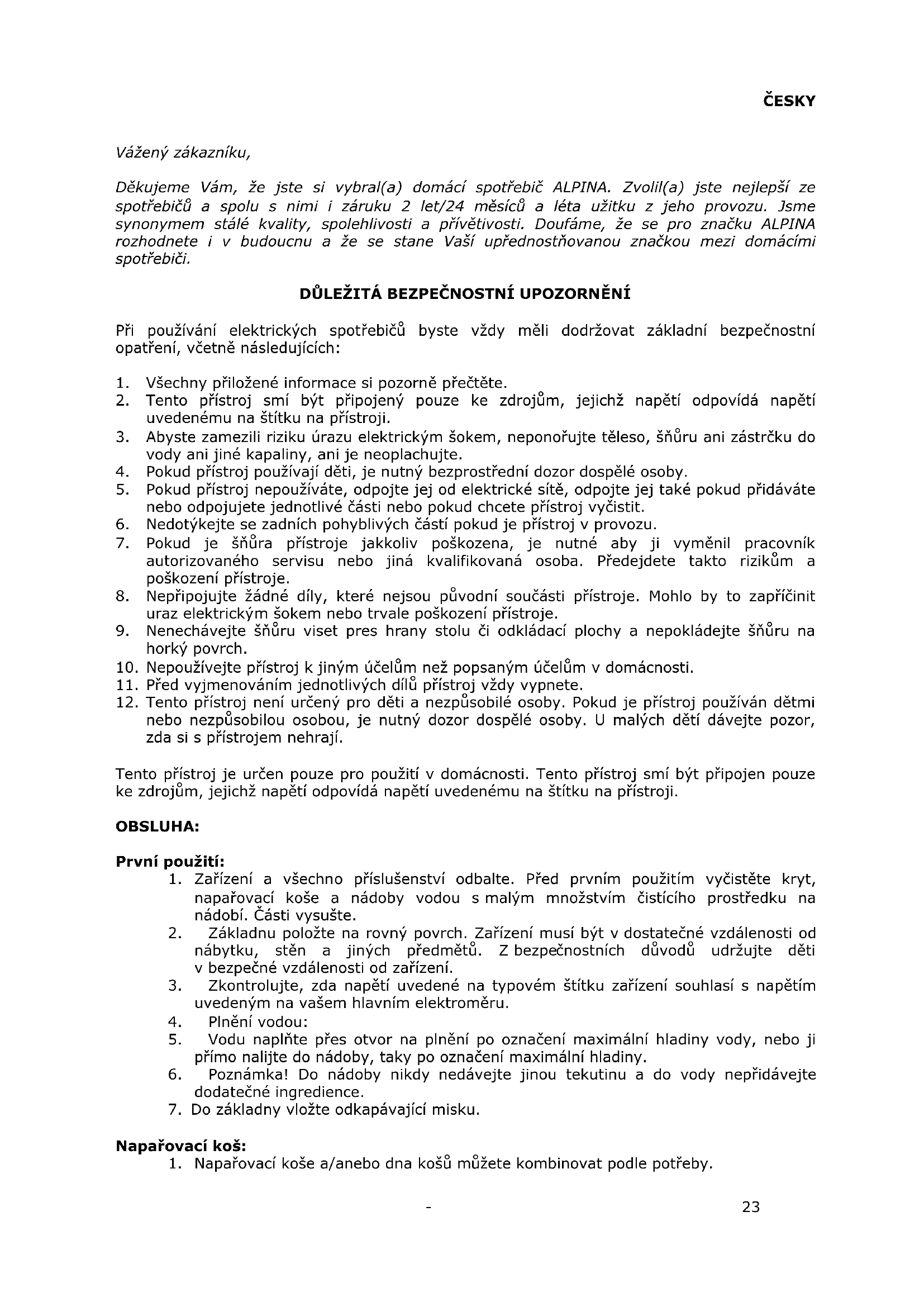 Vážený zákazníku, Děkujeme Vám, že jste si vybral(a) domácí spotřebič ALPINA. Zvolil(a) jste nejlepší ze spotřebičů a spolu s nimi i záruku 2 let/24 měsíců a léta užitku z jeho provozu. Jsme synonymem stálé kvality, spolehlivosti a přívětivosti. Doufáme, že se pro značku ALPINA rozhodnete i v budoucnu a že se stane Vaší upřednostňovanou značkou mezi domácími spotřebiči. DŮLEŽITÁ BEZPEČNOSTNÍ UPOZORNĚNÍ Při používání elektrických spotřebičů byste vždy měli dodržovat základní bezpečnostní opatření, včetně následujících: