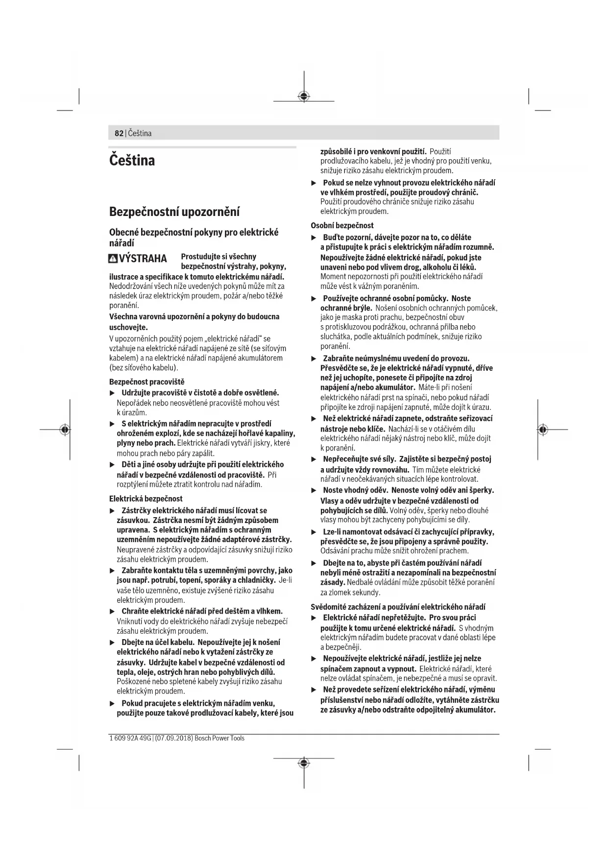 długości śruby, o średnicy równej średnicy gwintu śruby. Konserwacja i serwis Konserwacja i czyszczenie u Przed przystąpieniem do jakichkolwiek prac przy elektronarzędziu (np. prace konserwacyjne, wymiana osprzętu itp.), a także na czas transportu i przechowy- wania należy wyjąć z niego akumulator. Niezamierzone uruchomienie włącznika/wyłącznika grozi skaleczeniem. u Utrzymywanie urządzenia i szczelin wentylacyjnych w czystości gwarantuje prawidłową i bezpieczną pracę. Jeśli urządzenie, mimo dokładnej i wszechstronnej kontroli produkcyjnej ulegnie kiedykolwiek awarii, naprawę powinien przeprowadzić autoryzowany serwis elektronarzędzi firmy Bosch. Obsługa klienta oraz doradztwo dotyczące użytkowania Ze wszystkimi pytaniami, dotyczącymi naprawy ikonserwa- cji nabytego produktu oraz dostępu do części zamiennych, prosimy zwracać się do punktów obsługi klienta. Rysunki techniczne oraz informacje o częściach zamiennych można znaleźć pod adresem: www.bosch-pt.com Nasz zespół doradztwa dotyczącego użytkowania odpowie na wszystkie pytania związane z produktami firmy Bosch oraz ich osprzętem. Przy wszystkich zgłoszeniach oraz zamówieniach części za- miennych konieczne jest podanie 10‑cyfrowego numeru ka- talogowego, znajdującego się na tabliczce znamionowej pro- duktu. Polska Robert Bosch Sp. z o.o. Serwis Elektronarzędzi Ul. Jutrzenki 102/104 02-230 Warszawa Na www.serwisbosch.com znajdą Państwo wszystkie szcze- góły dotyczące usług serwisowych online. Tel.: 22 7154450 Faks: 22 7154441 E-mail: bsc@pl.bosch.com www.bosch-pt.pl Transport Załączone w dostawie akumulatory litowo-jonowe podlegają wymaganiom przepisów dotyczących towarów niebezpiecz- nych. Akumulatory mogą być transportowane drogą lądową przez użytkownika, bez konieczności spełnienia jakichkol- wiek dalszych warunków. W przypadku przesyłki przez osoby trzecie (np. transport drogą powietrzną lub za pośrednictwem firmy spedycyjnej) należy dostosować się do szczególnych wymogów dotyczą- cych opakowania i oznakowania towaru. W takim wypadku podczas przygotowywania towaru do wysyłki należy skonsul- tować się z ekspertem ds. towarów niebezpiecznych. Akumulatory można wysyłać tylko wówczas, gdy ich obudo- wa nie jest uszkodzona. Odsłonięte styki należy zakleić, a akumulator zapakować wtaki sposób, aby nie mógł on się poruszać (przesuwać) w opakowaniu. Należy wziąć też pod uwagę ewentualne inne przepisy prawa krajowego. Utylizacja odpadów Elektronarzędzia, akumulatory, osprzęt i opa- kowanie należy oddać do powtórnego przetwo- rzenia zgodnego z obowiązującymi przepisami w zakresie ochrony środowiska. Elektronarzędzia i akumulatora/baterii nie wol- no wyrzucać do odpadów domowych! Tylko dla krajów UE: Zgodnie z europejską dyrektywą 2012/19/UE niezdatne do użytku elektronarzędzia, a zgodnie z europejską dyrektywą 2006/66/WE uszkodzone lub zużyte akumulatory/baterie, należy zbierać osobno i doprowadzić do ponownego prze- tworzenia zgodnie z przepisami ochrony środowiska. Akumulatory/baterie: Li-Ion: Prosimy postępować zgodnie ze wskazówkami umieszczony- mi w rozdziale Transport (zob. „Transport“, Strona81). Polski | 81 Bosch Power Tools 1 609 92A 49G | (07.09.2018)82 | Čeština 1 609 92A 49G | (07.09.2018) Bosch Power Tools Čeština Bezpečnostní upozornění Obecné bezpečnostní pokyny pro elektrické nářadí VÝSTRAHA Prostudujte si všechny bezpečnostní výstrahy, pokyny, ilustrace aspecifikace ktomuto elektrickému nářadí. Nedodržování všech níže uvedených pokynů může mít za následek úraz elektrickým proudem, požár a/nebo těžké poranění. Všechna varovná upozornění apokyny do budoucna uschovejte. Vupozorněních použitý pojem „elektrické nářadí“ se vztahuje na elektrické nářadí napájené ze sítě (se síťovým kabelem) ana elektrické nářadí napájené akumulátorem (bez síťového kabelu). Bezpečnost pracoviště u Udržujte pracoviště včistotě adobře osvětlené. Nepořádek nebo neosvětlené pracoviště mohou vést kúrazům. u Selektrickým nářadím nepracujte vprostředí ohroženém explozí, kde se nacházejí hořlavé kapaliny, plyny nebo prach. Elektrické nářadí vytváří jiskry, které mohou prach nebo páry zapálit. u Děti ajiné osoby udržujte při použití elektrického nářadí vbezpečné vzdálenosti od pracoviště. Při rozptýlení můžete ztratit kontrolu nad nářadím. Elektrická bezpečnost u Zástrčky elektrického nářadí musí lícovat se zásuvkou. Zástrčka nesmí být žádným způsobem upravena. Selektrickým nářadím sochranným uzemněním nepoužívejte žádné adaptérové zástrčky. Neupravené zástrčky aodpovídající zásuvky snižují riziko zásahu elektrickým proudem. u Zabraňte kontaktu těla suzemněnými povrchy, jako jsou např. potrubí, topení, sporáky achladničky. Je‑li vaše tělo uzemněno, existuje zvýšené riziko zásahu elektrickým proudem. u Chraňte elektrické nářadí před deštěm avlhkem. Vniknutí vody do elektrického nářadí zvyšuje nebezpečí zásahu elektrickým proudem. u Dbejte na účel kabelu. Nepoužívejte jej knošení elektrického nářadí nebo kvytažení zástrčky ze zásuvky. Udržujte kabel vbezpečné vzdálenosti od tepla, oleje, ostrých hran nebo pohyblivých dílů. Poškozené nebo spletené kabely zvyšují riziko zásahu elektrickým proudem. u Pokud pracujete selektrickým nářadím venku, použijte pouze takové prodlužovací kabely, které jsou způsobilé ipro venkovní použití. Použití prodlužovacího kabelu, jež je vhodný pro použití venku, snižuje riziko zásahu elektrickým proudem. u Pokud se nelze vyhnout provozu elektrického nářadí ve vlhkém prostředí, použijte proudový chránič. Použití proudového chrániče snižuje riziko zásahu elektrickým proudem. Osobní bezpečno