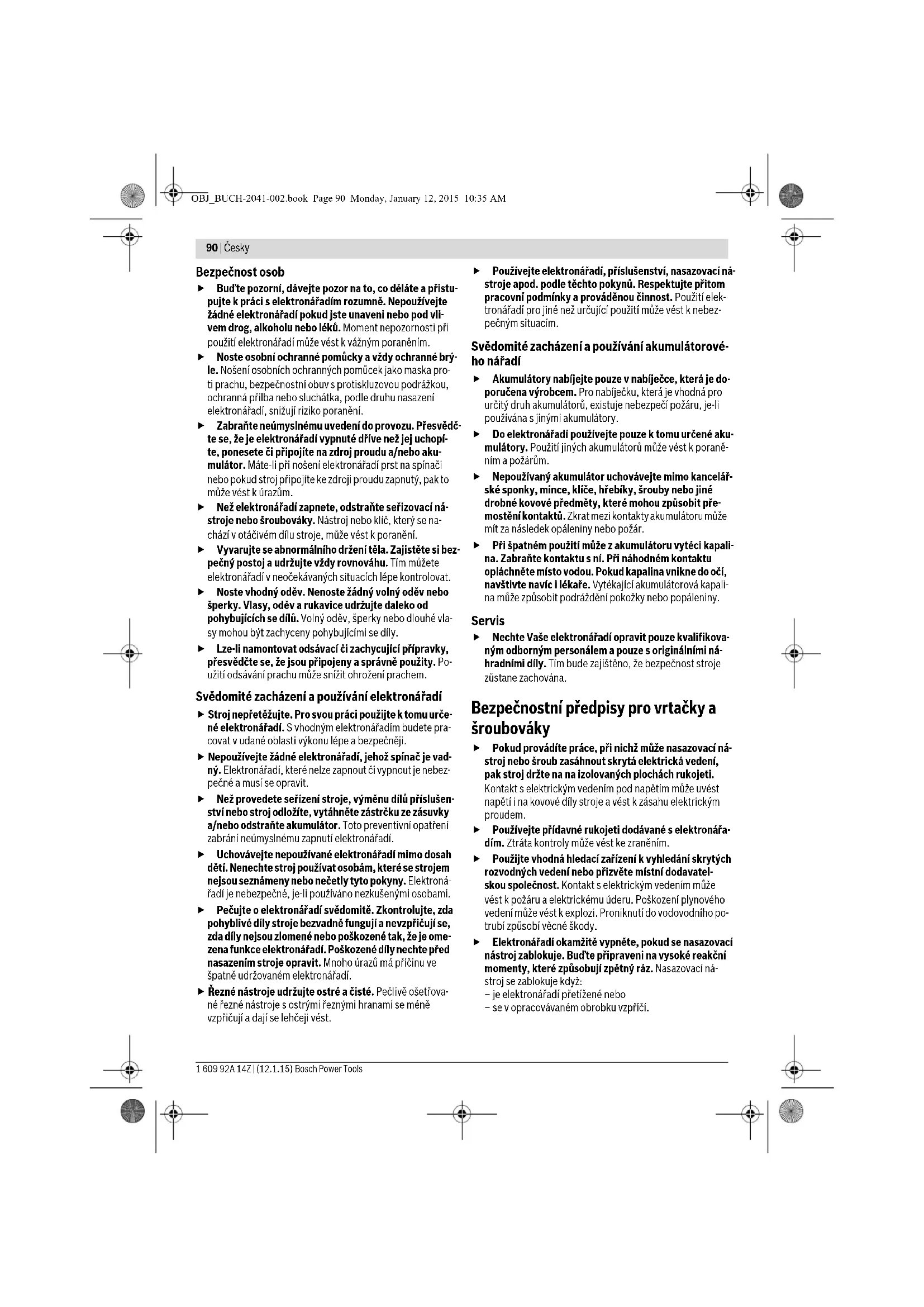 Mechaniczne przełączanie biegów 14 209 Włączanie/wyłączanie 15 210 Kontrola stanu naładowania akumulatora 16 210 Wybór osprzętu – 211 – 212 Planowane działanie Rysunek Wziąć pod uwagę Strona OBJ_BUCH-2041-002.book Page 88 Monday, January 12, 2015 10:35 AMČesky | 89 Bosch Power Tools 1 609 92A 14Z | (12.1.15) Przy wszystkich zgłoszeniach oraz zamówieniach części za- miennych konieczne jest podanie 10-cyfrowego numeru kata- logowego elektronarzędzia zgodnie z danymi na tabliczce zna- mionowej. Polska Robert Bosch Sp. z o.o. Serwis Elektronarzędzi Ul. Szyszkowa 35/37 02-285 Warszawa Na www.bosch-pt.pl znajdą Państwo wszystkie szczegóły dotyczące usług serwisowych online. Tel.: 22 7154460 Faks: 22 7154441 E-Mail: bsc@pl.bosch.com Infolinia Działu Elektronarzędzi: 801 100900 (w cenie połączenia lokalnego) E-Mail: elektronarzedzia.info@pl.bosch.com www.bosch.pl Transport Załączone w dostawie akumulatory litowo jonowe podlegają wymaganiom przepisów dotyczących towarów niebezpiecz- nych. Akumulatory mogą być transportowane drogą lądową przez użytkownika bez konieczności spełnienia jakichkolwiek dalszych warunków. W przypadku przesyłki przez osoby trzecie (np. transport dro- gą powietrzną lub za pośrednictwem firmy spedycyjnej) nale- ży dostosować się do szczególnych wymogów dotyczących opakowania i znaczenia towaru. W takim wypadku podczas przygotowywania towaru do wysyłki należy skonsultować się z ekspertem d/s towarów niebezpiecznych. Akumulatory można wysyłać tylko wówczas, gdy ich obudowa nie jest uszkodzona. Odsłonięte styki należy zakleić, a akumu- lator zapakować w taki sposób, aby nie mógł on się poruszać (przesuwać) w opakowaniu. Należy wziąć też pod uwagę ewentualne przepisy prawa krajo- wego. Usuwanie odpadów Elektronarzędzia, akumulatory, osprzęt i opakowanie należy oddać do powtórnego przetworzenia zgodne- go z obowiązującymi przepisami w zakresie ochrony środowiska. Elektronarzędzia i akumulatora/baterii nie wolno wyrzucać do odpadów domowych! Tylko dla państw należących do UE: Zgodnie z europejską wytyczną 2012/19/UE, niezdatne do użytku elektro- narzędzia, a zgodnie z europejską wytyczną 2006/66/WE uszkodzone lub zużyte akumu- latory/baterie, należy zbierać osobno i do- prowadzić do ponownego przetworzenia zgodnego z zasadami ochrony środowiska. Zastrzega się prawo dokonywania zmian. Česky Všeobecná varovná upozornění pro elektronářadí Čtěte všechna varovná upozornění a pokyny. Zanedbání při dodržování va- rovných upozornění a pokynů mohou mít za následek zásah elektrickým proudem, požár a/nebo těžká poranění. Všechna varovná upozornění a pokyny do budoucna uschovejte. Ve varovných upozorněních použitý pojem „elektronářadí“ se vztahuje na elektronářadí provozované na el. síti (se síťovým kabelem) a na elektronářadí provozované na akumulátoru (bez síťového kabelu). Bezpečnost pracovního místa Udržujte Vaše pracovní místo čisté a dobře osvětlené. Nepořádek nebo neosvětlené pracovní oblasti mohou vést k úrazům. S elektronářadím nepracujte v prostředí ohroženém explozí, kde se nacházejí hořlavé kapaliny, plyny nebo prach. Elektronářadí vytváří jiskry, které mohou prach ne- bo páry zapálit. Děti a jiné osoby udržujte při použití elektronářadí da- leko od Vašeho pracovního místa. Při rozptýlení můžete ztratit kontrolu nad strojem. Elektrická bezpečnost Připojovací zástrčka elektronářadí musí lícovat se zá- suvkou. Zástrčka nesmí být žádným způsobem uprave- na. Společně s elektronářadím s ochranným uzemně- ním nepoužívejte žádné adaptérové zástrčky. Neupra- vené zástrčky a vhodné zásuvky snižují riziko zásahu elek- trickým proudem. Zabraňte kontaktu těla s uzemněnými povrchy, jako např. potrubí, topení, sporáky a chladničky. Je-li Vaše tělo uzemněno, existuje zvýšené riziko zásahu elektrickým proudem. Chraňte stroj před deštěm a vlhkem. Vniknutí vody do elektronářadí zvyšuje nebezpečí zásahu elektrickým prou- dem. Dbejte na účel kabelu, nepoužívejte jej k nošení či zavě- šení elektronářadí nebo k vytažení zástrčky ze zásuv- ky. Udržujte kabel daleko od tepla, oleje, ostrých hran nebo pohyblivých dílů stroje. Poškozené nebo spletené kabely zvyšují riziko zásahu elektrickým proudem. Pokud pracujete s elektronářadím venku, použijte pou- ze takové prodlužovací kabely, které jsou způsobilé i pro venkovní použití. Použití prodlužovacího kabelu, jež je vhodný pro použití venku, snižuje riziko zásahu elektric- kým proudem. Pokud se nelze vyhnout provozu elektronářadí ve vlh- kém prostředí, použijte proudový chránič. Nasazení proudového chrániče snižuje riziko zásahu elektrickým proudem. VAROVÁNÍ OBJ_BUCH-2041-002.book Page 89 Monday, January 12, 2015 10:35 AM90 | Česky 1 609 92A 14Z | (12.1.15) Bosch Power Tools Bezpečnost osob Buďte pozorní, dávejte pozor na to, co děláte a přistu- pujte k práci s elektronářadím rozumně. Nepoužívejte žádné elektronářadí pokud jste unaveni nebo pod vli- vem drog, alkoholu nebo léků. Moment nepozornosti při použití elektronářadí může vést k vážným poraněním. Noste osobní ochranné pomůcky a vždy ochranné brý- le. Nošení osobních ochranných pomůcek jako maska pro- ti prachu, bezpečnostní obuv s protiskluzovou podrážkou, ochranná přilba nebo sluchátka, podle druhu nasazení elektronářadí, snižují riziko poranění. Zabraňte neúmyslnému uvedení do provozu. Přesvědč- te se, že je elektronářadí vypnuté dříve než jej uchopí- te, ponesete či připojíte na zdroj proudu a/nebo aku- mulátor. Máte-li při nošení elektronářadí prst na spínači nebo pokud stroj připojíte ke zdroji proudu zapnutý, pak to můž