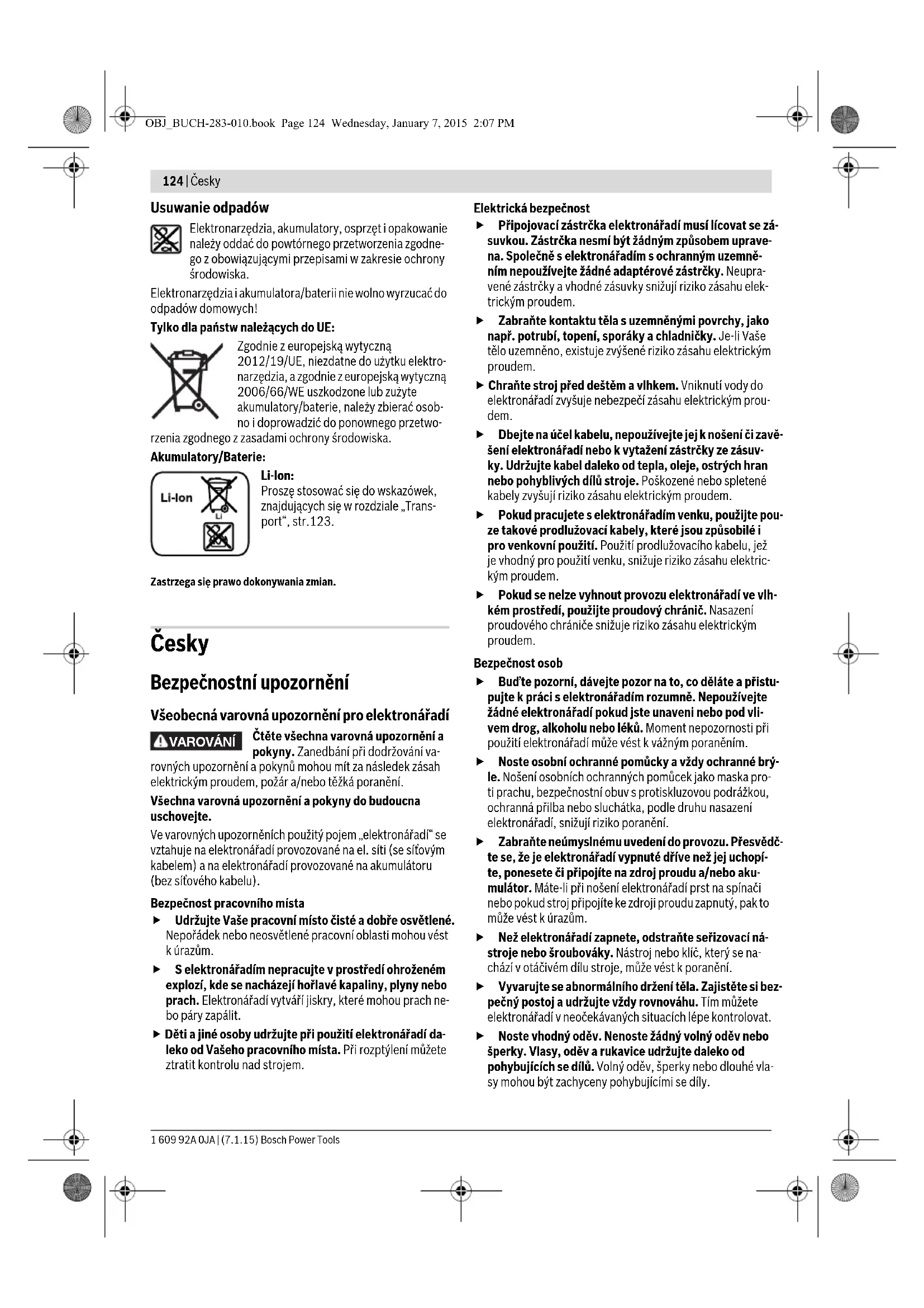 - * Omezený výkon při teplotách <0 °C Technická data zjištěna s akumulátorem z obsahu dodávky. OBJ_BUCH-283-010.book Page 127 Wednesday, January 7, 2015 2:07 PM128 | Česky 1 609 92A 0JA | (7.1.15) Bosch Power Tools Ukazatel stavu nabití akumulátoru Tři zelené kontrolky LED ukazatele stavu nabití akumulátoru 20 indikují stav nabití akumulátoru 11. Z bezpečnostních dů- vodů je dotaz na stav nabití možný pouze za stavu klidu elek- tronářadí. – Stlačte tlačítko 21, aby se ukázal stav nabití (možné i při odejmutém akumulátoru). Po ca. 5 sekundách ukazatel stavu nabití automaticky zhasne. Nesvítí-li po stlačení tlačítka 21 žádná LED, je akumulátor vadný a musí být vyměněn. Během procesu nabíjení se tři zelené kontrolky LED po sobě krátce rozsvěcují a zhasínají. Akumulátor je plně nabitý, když tyto tři zelené kontrolky LED svítí trvale. Asi 5 minut poté, co byl akumulátor plně nabit, tři zelené kontrolky LED opět zhas- nou. Přídavná rukojeť Používejte Vaše elektronářadí pouze s přídavnou ruko- jetí 16. Natočení přídavné rukojeti (viz obr. B) Abyste dosáhli bezpečné a bezúnavové pracovní držení, mů- žete přídavné držadlo 16 libovolně natočit. – Otáčejte spodní částí přídavné rukojeti 16 proti směru ho- dinových ručiček a přídavnou rukojeť 16 natočte do poža- dované polohy. Poté otáčením spodní části přídavné ruko- jeti 16 ve směru hodinových ručiček ji opět upevněte. Dávejte pozor na to, aby upínací pásek přídavné rukojeti ležel v k tomu určené drážce na tělese. Volba sklíčidla a nástrojů Pro příklepové vrtání a sekání potřebujete nástroje SDS-plus, jež se nasazují do sklíčidla SDS-plus. Pro vrtání bez příklepu do dřeva, kovu, keramiky a umělé hmoty a též pro šroubování se používají nástroje bez SDS-plus (např. vrták s válcovou stopkou). Pro tyto nástroje potřebuje- te rychloupínací sklíčidlo resp. ozubené sklíčidlo. Nasazení/vyjmutí ozubeného sklíčidla (GBH 36 V-LI Plus) Abyste mohli pracovat s nástroji bez SDS-plus (např. vrták s válcovou stopkou), musíte namontovat vhodné sklíčidlo (ozu- bené nebo rychloupínací sklíčidlo, příslušenství). Montáž ozubeného sklíčidla (viz obr. C) – Našroubujte upínací stopku SDS-plus 24 do ozubeného sklíčidla 23. Ozubené sklíčidlo 23 zajistěte pojistným šroubem 22. Dbejte na to, že pojistný šroub má levý závit. Nasazení ozubeného sklíčidla (viz obr. C) – Nástrčný konec upínací stopky očistěte a lehce namažte. – Ozubené sklíčidlo s upínací stopkou nasaďte otáčivě do ná- strojového držáku až se automaticky zajistí. – Zajištění prověřte tahem za ozubené sklíčidlo. Odejmutí ozubeného sklíčidla – Posuňte uzamykací pouzdro 5 dozadu a ozubené sklíčidlo 23 odejměte. Odejmutí/nasazení výměnného sklíčidla (GBH 36 VF-LI Plus) Výměnné sklíčidlo SDS-plus 2 může být lehce zaměněno za dodávané rychloupínací výměnné sklíčidlo 1. Odejmutí výměnného sklíčidla (viz obr. D) – Uzamykací kroužek výměnného sklíčidla 6 stáhněte doza- du, podržte jej pevně v této poloze a výměnné sklíčidlo SDS-plus 2 příp. rychloupínací výměnné sklíčidlo 1 stáh- něte dopředu. – Výměnné sklíčidlo chraňte po odejmutí před znečištěním. Nasazení výměnného sklíčidla (viz obr. E) – Výměnné sklíčidlo před nasazením očistěte a nástrčný ko- nec lehce namažte. –Výměnné sklíčidlo SDS-plus 2 příp. rychloupínací výměn- né sklíčidlo 1 uchopte celou rukou. Výměnné sklíčidlo otá- čivě nasuňte na upnutí sklíčidla 25, až uslyšíte zřetelný zvuk zapadnutí. – Výměnné sklíčidlo se automaticky zajistí. Zkontrolujte za- jištění zatažením za výměnné sklíčidlo. Výměna nástroje Ochranná protiprachová krytka 4 zabraňuje dalekosáhlému vniknutí prachu z vrtání do nástrojového držáku během pro- vozu. Dbejte při nasazování nástroje na to, aby ochranná pro- tiprachová krytka 4 nebyla poškozena. Poškozenou protiprachovou krytku ihned nahraďte. Doporučuje se nechat to provést odborným servisem. Výměna nástroje (SDS-plus) Nasazení nástroje SDS-plus (viz obr. F) S vrtacím sklíčidlem SDS-plus můžete nástroj jednoduše a po- hodlně vyměnit bez použití dalších nástrojů. – GBH 36 VF-LI Plus: Nasaďte výměnné sklíčidlo SDS-plus