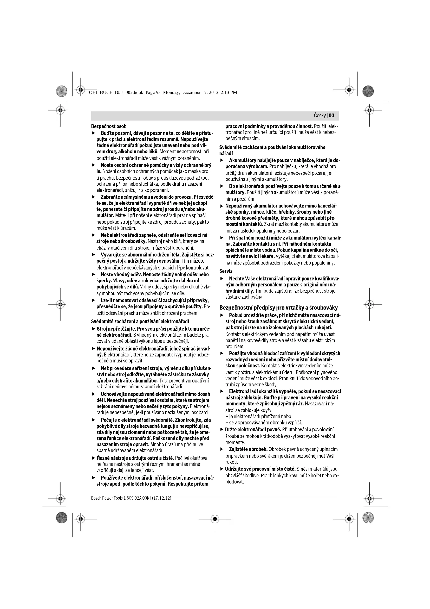 OBJ_BUCH-1051-002.book Page 91 Monday, December 17, 2012 2:13 PM92 | Česky 1 609 92A 00N | (17.12.12) Bosch Power Tools Nasz zespół doradztwa dotyczącego użytkowania odpowie na wszystkie pytania związane z produktami firmy Bosch oraz ich osprzętem. Polska Robert Bosch Sp. z o.o. Serwis Elektronarzędzi Ul. Szyszkowa 35/37 02-285 Warszawa Tel.: 22 7154460 Faks: 22 7154441 E-Mail: bsc@pl.bosch.com Infolinia Działu Elektronarzędzi: 801 100900 (w cenie połączenia lokalnego) E-Mail: elektronarzedzia.info@pl.bosch.com www.bosch.pl Transport Załączone w dostawie akumulatory litowo jonowe podlegają wymaganiom przepisów dotyczących towarów niebezpiecz- nych. Akumulatory mogą być transportowane drogą lądową przez użytkownika bez konieczności spełnienia jakichkolwiek dalszych warunków. W przypadku przesyłki przez osoby trzecie (np. transport dro- gą powietrzną lub za pośrednictwem firmy spedycyjnej) nale- ży dostosować się do szczególnych wymogów dotyczących opakowania i znaczenia towaru. W takim wypadku podczas przygotowywania towaru do wysyłki należy skonsultować się z ekspertem d/s towarów niebezpiecznych. Akumulatory można wysyłać tylko wówczas, gdy ich obudowa nie jest uszkodzona. Odsłonięte styki należy zakleić, a akumu- lator zapakować w taki sposób, aby nie mógł on się poruszać (przesuwać) w opakowaniu. Należy wziąć też pod uwagę ewentualne przepisy prawa krajo- wego. Usuwanie odpadów Elektronarzędzia, akumulatory, osprzęt i opakowanie należy oddać do powtórnego przetworzenia zgodne- go z obowiązującymi przepisami w zakresie ochrony środowiska. Elektronarzędzia i akumulatora/baterii nie wolno wyrzucać do odpadów domowych! Tylko dla państw należących do UE: Zgodnie z europejską wytyczną 2002/96/WE, niezdatne do użytku elektro- narzędzia, a zgodnie z europejską wytyczną 2006/66/WE uszkodzone lub zużyte akumulatory/baterie, należy zbierać osob- no i doprowadzić do ponownego przetwo- rzenia zgodnego z zasadami ochrony środowiska. Akumulatory/Baterie: Li-Ion: Proszę stosować się do wskazówek, znajdujących się w rozdziale „Trans- port“, str.92. Zastrzega się prawo dokonywania zmian. Česky Bezpečnostní upozornění Všeobecná varovná upozornění pro elektronářadí Čtěte všechna varovná upozornění a pokyny. Zanedbání při dodržování va- rovných upozornění a pokynů mohou mít za následek zásah elektrickým proudem, požár a/nebo těžká poranění. Všechna varovná upozornění a pokyny do budoucna uschovejte. Ve varovných upozorněních použitý pojem „elektronářadí“ se vztahuje na elektronářadí provozované na el. síti (se síťovým kabelem) a na elektronářadí provozované na akumulátoru (bez síťového kabelu). Bezpečnost pracovního místa Udržujte Vaše pracovní místo čisté a dobře osvětlené. Nepořádek nebo neosvětlené pracovní oblasti mohou vést k úrazům. S elektronářadím nepracujte v prostředí ohroženém explozí, kde se nacházejí hořlavé kapaliny, plyny nebo prach. Elektronářadí vytváří jiskry, které mohou prach ne- bo páry zapálit. Děti a jiné osoby udržujte při použití elektronářadí da- leko od Vašeho pracovního místa. Při rozptýlení můžete ztratit kontrolu nad strojem. Elektrická bezpečnost Připojovací zástrčka elektronářadí musí lícovat se zá- suvkou. Zástrčka nesmí být žádným způsobem uprave- na. Společně s elektronářadím s ochranným uzemně- ním nepoužívejte žádné adaptérové zástrčky. Neupra- vené zástrčky a vhodné zásuvky snižují riziko zásahu elek- trickým proudem. Zabraňte kontaktu těla s uzemněnými povrchy, jako např. potrubí, topení, sporáky a chladničky. Je-li Vaše tělo uzemněno, existuje zvýšené riziko zásahu elektrickým proudem. Chraňte stroj před deštěm a vlhkem. Vniknutí vody do elektronářadí zvyšuje nebezpečí zásahu elektrickým prou- dem. Dbejte na účel kabelu, nepoužívejte jej k nošení či zavě- šení elektronářadí nebo k vytažení zástrčky ze zásuv- ky. Udržujte kabel daleko od tepla, oleje, ostrých hran nebo pohyblivých dílů stroje. Poškozené nebo spletené kabely zvyšují riziko zásahu elektrickým proudem. Pokud pracujete s elektronářadím venku, použijte pou- ze takové prodlužovací kabely, které jsou způsobilé i pro venkovní použití. Použití prodlužovacího kabelu, jež je vhodný pro použití venku, snižuje riziko zásahu elektric- kým proudem. Pokud se nelze vyhnout provozu elektronářadí ve vlh- kém prostředí, použijte proudový chránič. Nasazení proudového chrániče snižuje riziko zásahu elektrickým proudem. VAROVÁNÍ OBJ_BUCH-1051-002.book Page 92 Monday, December 17, 2012 2:13 PMČesky | 93 Bosch Power Tools 1 609 92A 00N | (17.12.12) Bezpečnost osob Buďte pozorní, dávejte pozor na to, co děláte a přistu- pujte k práci s elektronářadím rozumně. Nepoužívejte žádné elektronářadí pokud jste unaveni nebo pod vli- vem drog, alkoholu nebo léků. Moment nepozornosti při použití elektronářadí může vést k vážným poraněním. Noste osobní ochranné pomůcky a vždy ochranné brý- le. Nošení osobních ochranných pomůcek jako maska pro- ti prachu, bezpečnostní obuv s protiskluzovou podrážkou, ochranná přilba nebo sluchátka, podle druhu nasazení elektronářadí, snižují riziko poranění. Zabraňte neúmyslnému uvedení do provozu. Přesvědč- te se, že je elektronářadí vypnuté dříve než jej uchopí- te, ponesete či připojíte na zdroj proudu a/nebo aku- mulátor. Máte-li při nošení elektronářadí prst na spínači nebo pokud stroj připojíte ke zdroji proudu zapnutý, pak to může vést k úrazům. Než elektronářadí zapnete, odstraňte seřizovací ná- stroje nebo šroubováky. Nástroj nebo klíč, který se na- chází v otáčivém dílu stroje, může vést k poranění. Vy