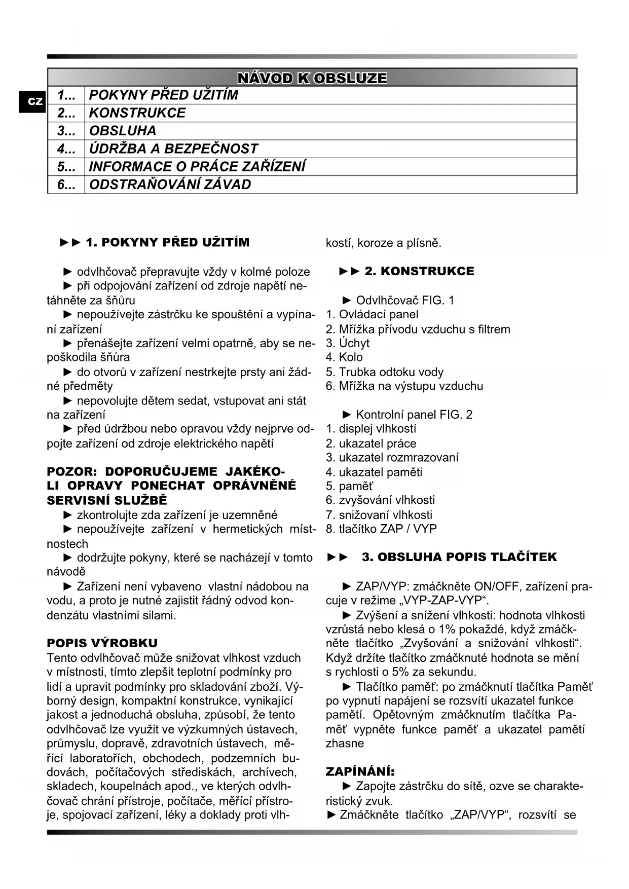 LI OPRAVY PONECHAT OPRáVNěNÉ SERVISNÍ SLUŽbě ► zkontrolujte zda zařízení je uzemněné ► nepoužívejte zařízení v hermetických míst- nostech ► dodržujte pokyny, které se nacházejí v tomto návodě ► Zařízení není vybaveno vlastní nádobou na vodu, a proto je nutné zajistit řádný odvod kon- denzátu vlastními silami. POPIS VýROBKU Tento odvlhčovač může snižovat vlhkost vzduch v místnosti, tímto zlepšit teplotní podmínky pro lidí a upravit podmínky pro skladování zboží. Vý- borný design, kompaktní konstrukce, vynikající jakost a jednoduchá obsluha, způsobí, že tento odvlhčovač lze využit ve výzkumných ústavech, průmyslu, dopravě, zdravotních ústavech, mě- řící laboratořích, obchodech, podzemních bu- dovách, počítačových střediskách, archívech, skladech, koupelnách apod., ve kterých odvlh- čovač chrání přístroje, počítače, měřící přístro- je, spojovací zařízení, léky a doklady proti vlh- kostí, koroze a plísně. ► 2. KONSTRUKCE ► Odvlhčovač FIG. 1