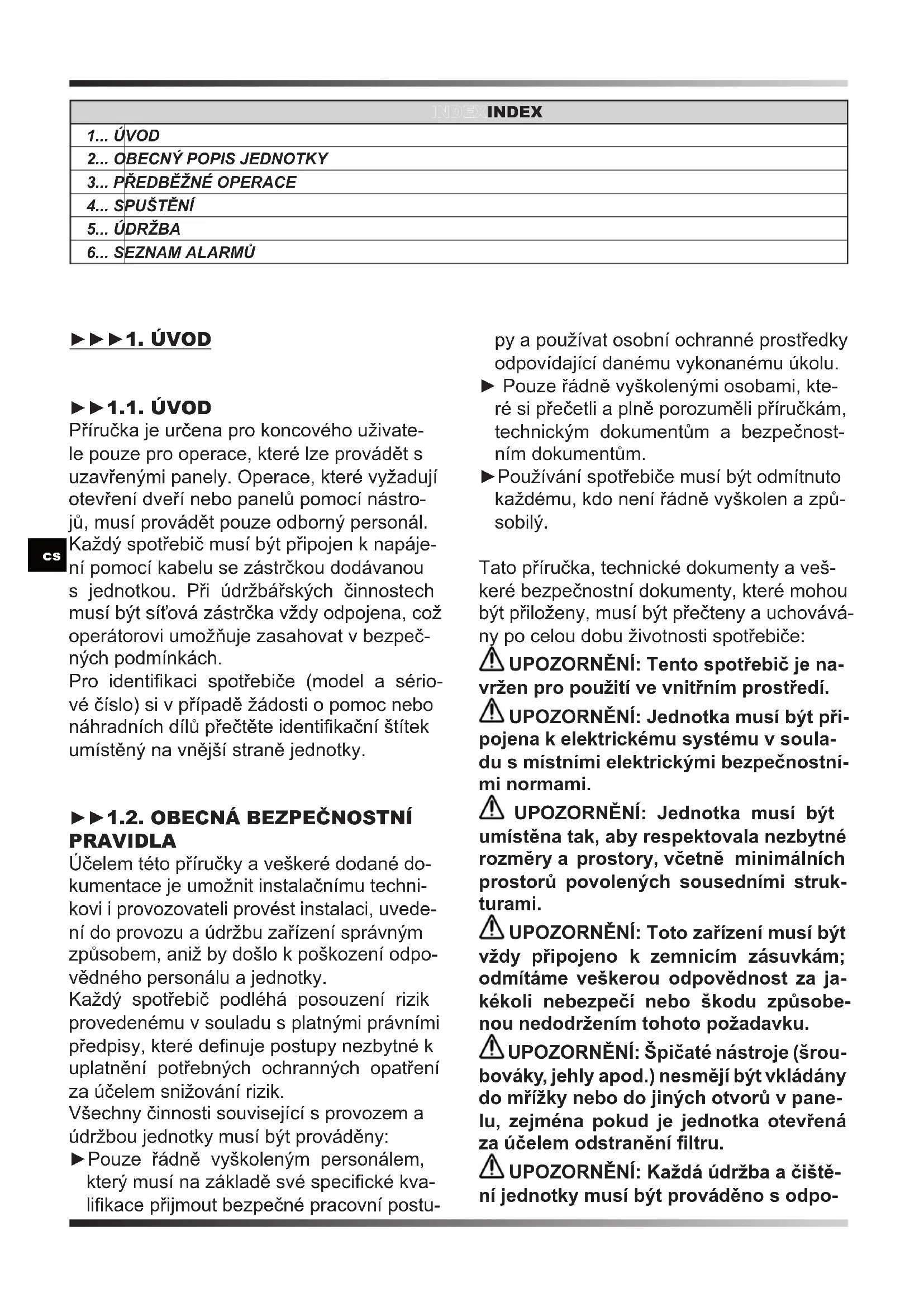 PRAVIDLA Účelem této příručky a veškeré dodané do- kumentace je umožnit instalačnímu techni- kovi i provozovateli provést instalaci, uvede- ní do provozu a údržbu zařízení správným způsobem, aniž by došlo k poškození odpo- vědného personálu a jednotky. Každý spotřebič podléhá posouzení rizik provedenému v souladu s platnými právními předpisy, které denuje postupy nezbytné k uplatnění potřebných ochranných opatření za účelem snižování rizik. Všechny činnosti související s provozem a údržbou jednotky musí být prováděny: ►Pouze řádně vyškoleným personálem, který musí na základě své specické kva- likace přijmout bezpečné pracovní postu- py a používat osobní ochranné prostředky odpovídající danému vykonanému úkolu. ► Pouze řádně vyškolenými osobami, kte- ré si přečetli a plně porozuměli příručkám, technickým dokumentům a bezpečnost- ním dokumentům. ►Používání spotřebiče musí být odmítnuto každému, kdo není řádně vyškolen a způ- sobilý. Tato příručka, technické dokumenty a veš- keré bezpečnostní dokumenty, které mohou být přiloženy, musí být přečteny a uchovává- ny po celou dobu životnosti spotřebiče: UPOZORNĚNÍ: Tento spotřebič je na- vržen pro použití ve vnitřním prostředí. UPOZORNĚNÍ: Jednotka musí být při- pojena k elektrickému systému v soula- du s místními elektrickými bezpečnostní- mi normami. UPOZORNĚNÍ: Jednotka musí být umístěna tak, aby respektovala nezbytné rozměry a prostory, včetně minimálních prostorů povolených sousedními struk- turami. UPOZORNĚNÍ: Toto zařízení musí být vždy připojeno k zemnicím zásuvkám; odmítáme veškerou odpovědnost za ja- kékoli nebezpečí nebo škodu způsobe- nou nedodržením tohoto požadavku. UPOZORNĚNÍ: Špičaté nástroje (šrou- bováky, jehly apod.) nesmějí být vkládány do mřížky nebo do jiných otvorů v pane- lu, zejména pokud je jednotka otevřená za účelem odstranění ltru. UPOZORNĚNÍ: Každá údržba a čiště- ní jednotky musí být prováděno s odpo-en