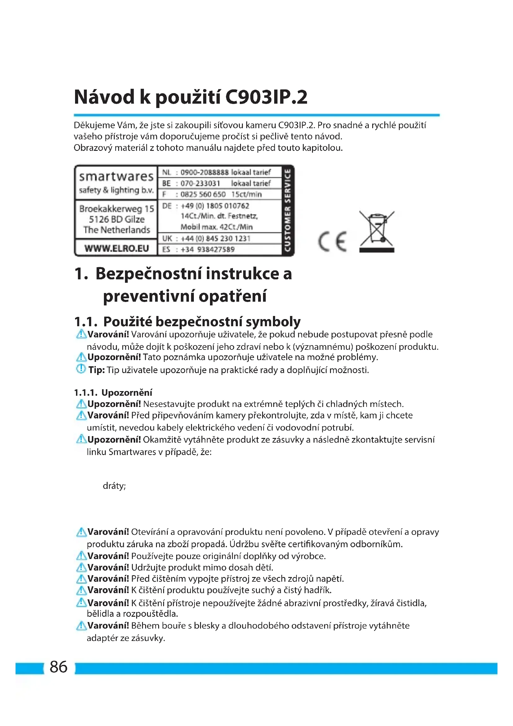 Για αυτήν τη συσκευή ισχύει μία περιορισμένη 3 ετήσια εγγύηση. Για τους όρους της εγγύησης κοιτάξτε στο : www.elro.eu.86 Návod k použití C903IP.2 Děkujeme Vám, že jste si zakoupili síťovou kameru C903IP.2. Pro snadné a rychlé použití vašeho přístroje vám doporučujeme pročíst si pečlivě tento návod. Obrazový materiál z tohoto manuálu najdete před touto kapitolou.