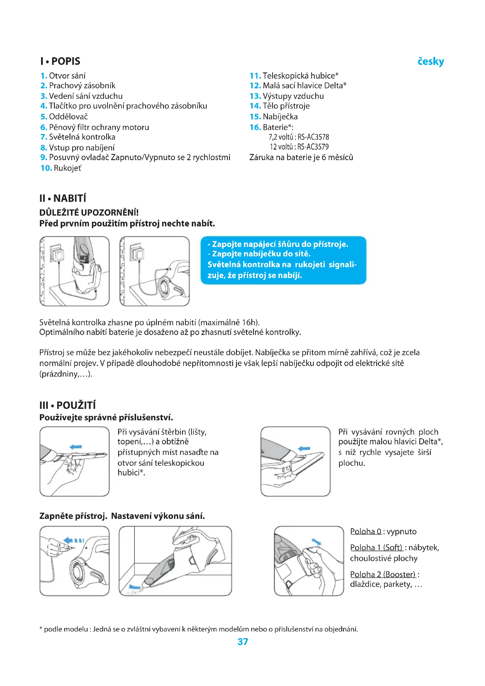 - podle modelu : Jedná se o zvláštní vybavení k některým modelům nebo o příslušenství na objednání. Při vysávání rovných ploch použijte malou hlavici Delta*, s níž rychle vysajete širší plochu. - Zapojte napájecí šňůru do přístroje. - Zapojte nabíječku do sítě. Světelná kontrolka na rukojeti signali- zuje, že přístroj se nabíjí. I • POPIS