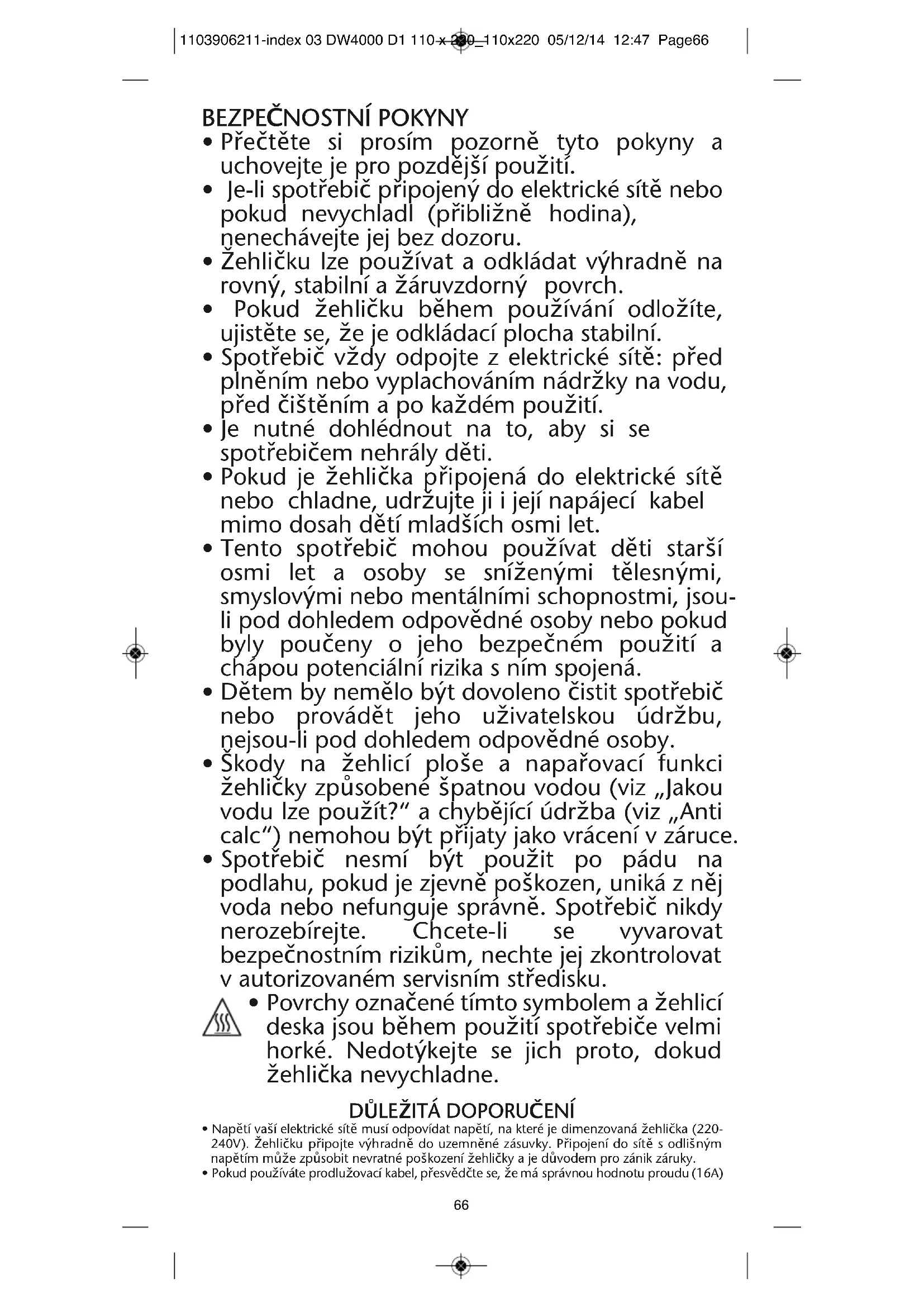 - Podle modelu 1103906211-index 03 DW4000 D1 110 x 220_110x220 05/12/14 12:47 Page6768 MoÏné problémy? Pfii jak˘chkoliv jin˘ch problémech se obraÈte na autorizovan˘ servis, kter˘ Va‰i Ïehliãku zkontroluje. Îivotní prostfiedí Podílejme se na ochranû Ïivotního prostfiedí! i Vበpfiístroj obsahuje ãetné zhodnotitelné nebo recyklovatelné materiály.‹ Svûfite jej sbûrnému místu nebo, neexistuje-li, smluvnímu servisnímu stfiedisku, kde s ním bude naloÏeno odpovídajícím zpÛsobem. PROBLÉMY MOÎNÉ P¤ÍâINY ¤E·ENÍ