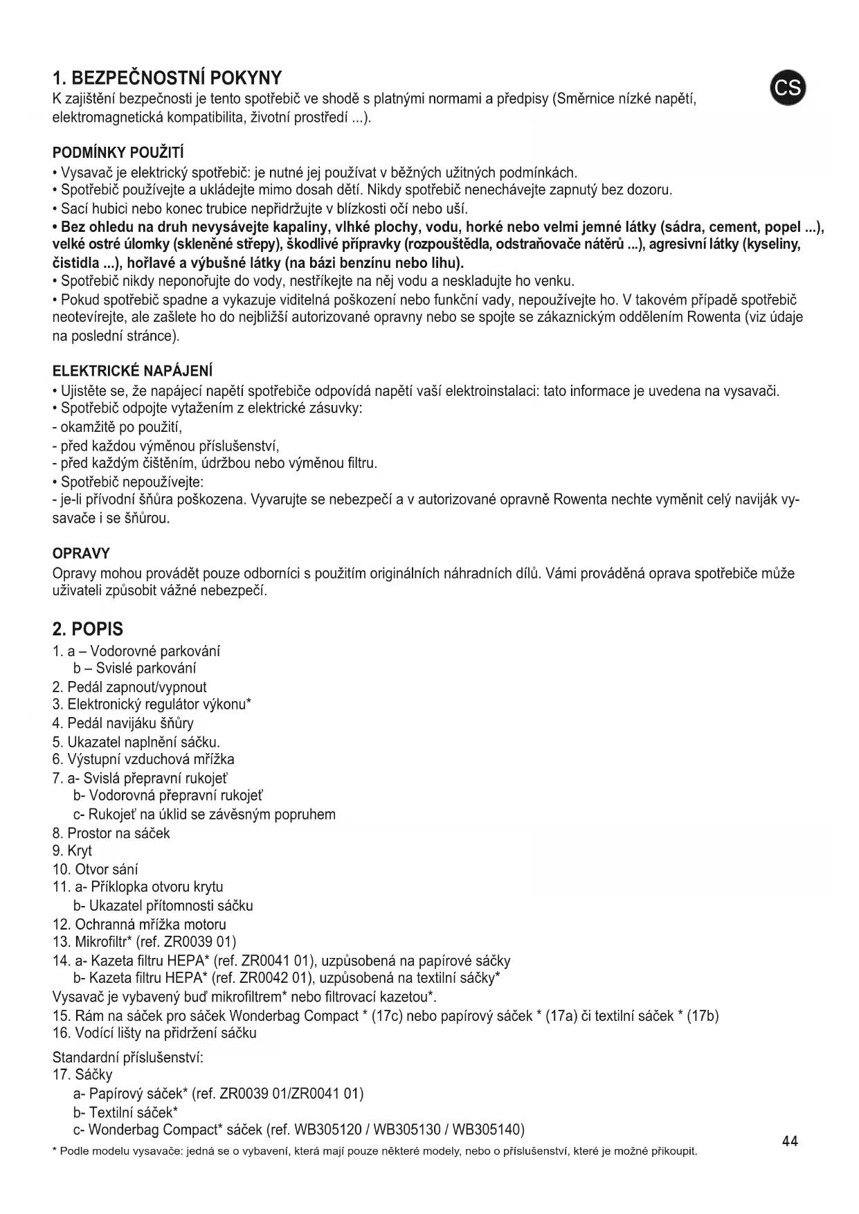 - Spotřebič nepoužívejte: - je-li přívodní šňůra poškozena. Vyvarujte se nebezpečí a v autorizované opravně Rowenta nechte vyměnit celý naviják vy- savače i se šňůrou. OPRAVY Opravy mohou provádět pouze odborníci s použitím originálních náhradních dílů. Vámi prováděná oprava spotřebiče může uživateli způsobit vážné nebezpečí.