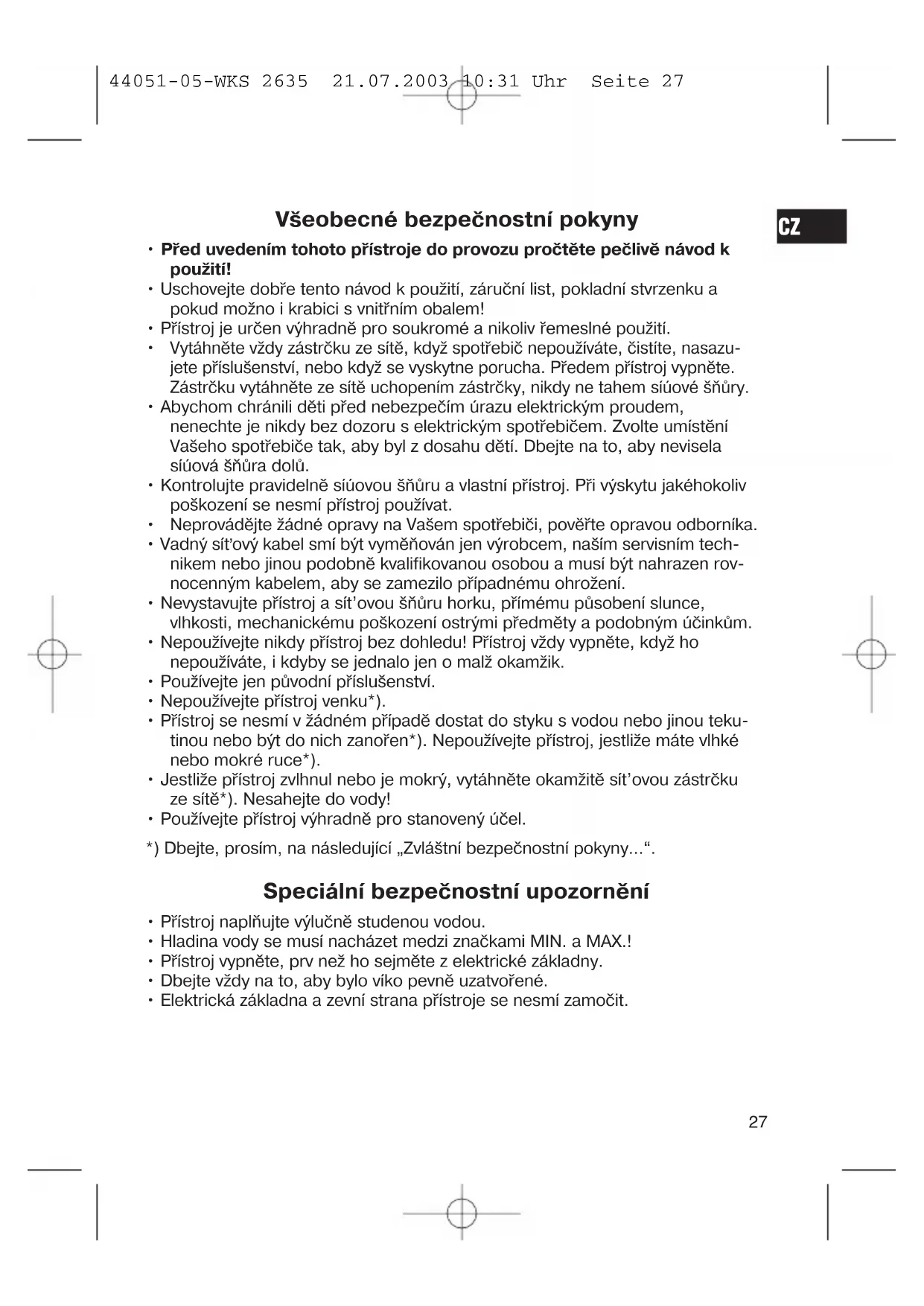 *) Dbejte, prosim, na následujíci „Zvlástní bezpečnostní tokyny...".