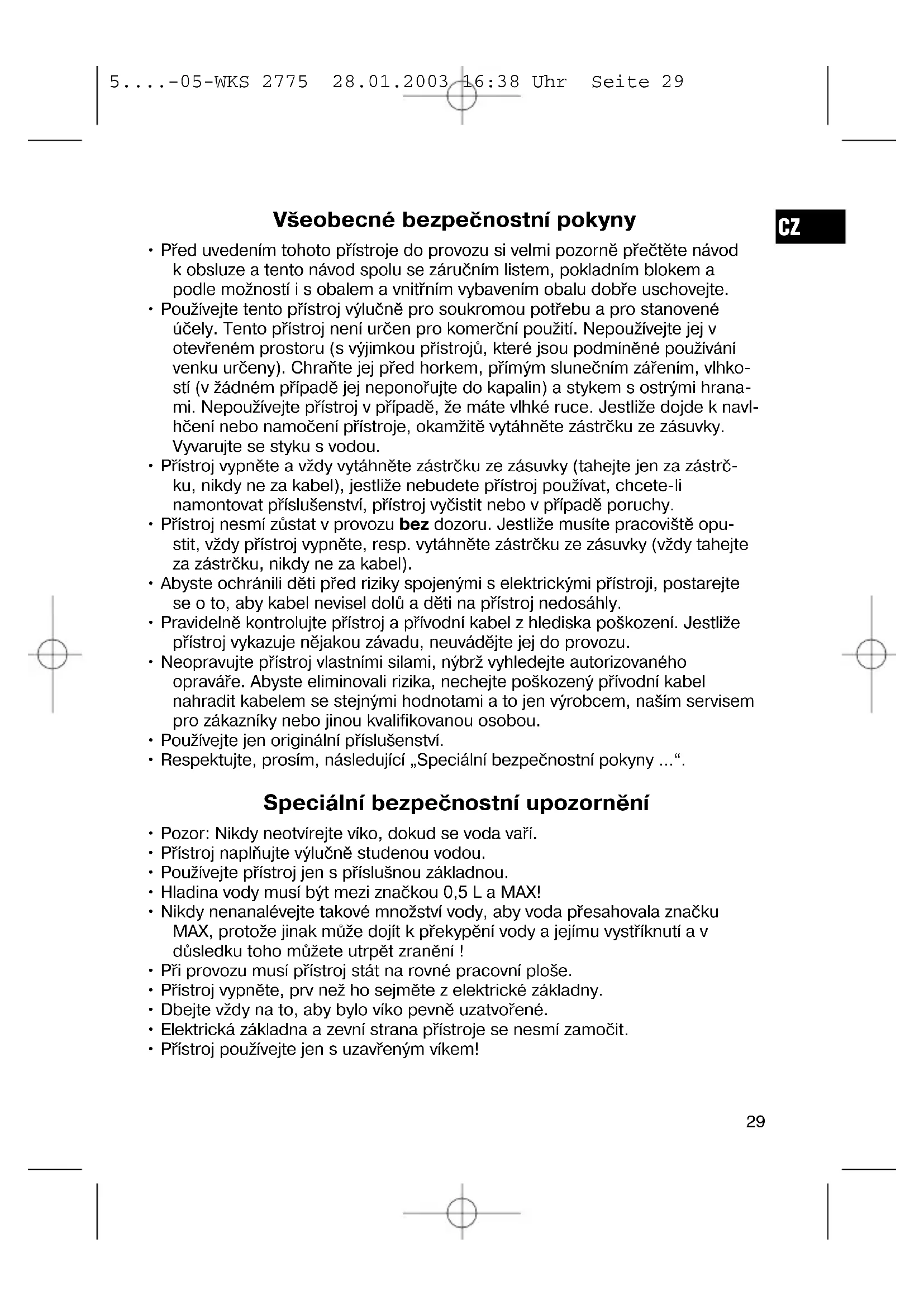 - Respektujte, prosim, následujíci „Speziární bezpečnostní pokyny ...".