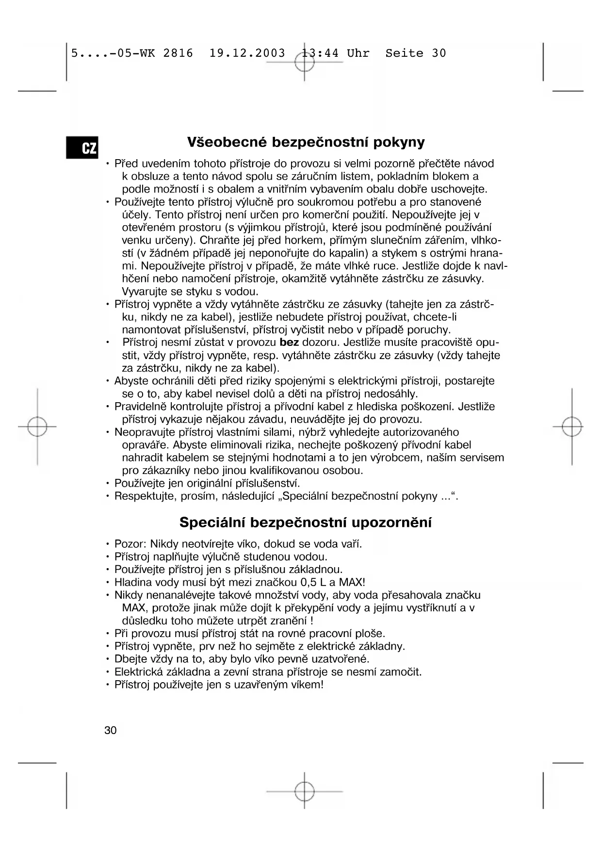 5....-05-WK 2816 19.12.2003 13:44 Uhr Seite 30Uvedení přístroje v činnost Před používáním přístroje svařte 2x čistou vodu bez přísad. Tuto vodu prosím nepoužívejte.