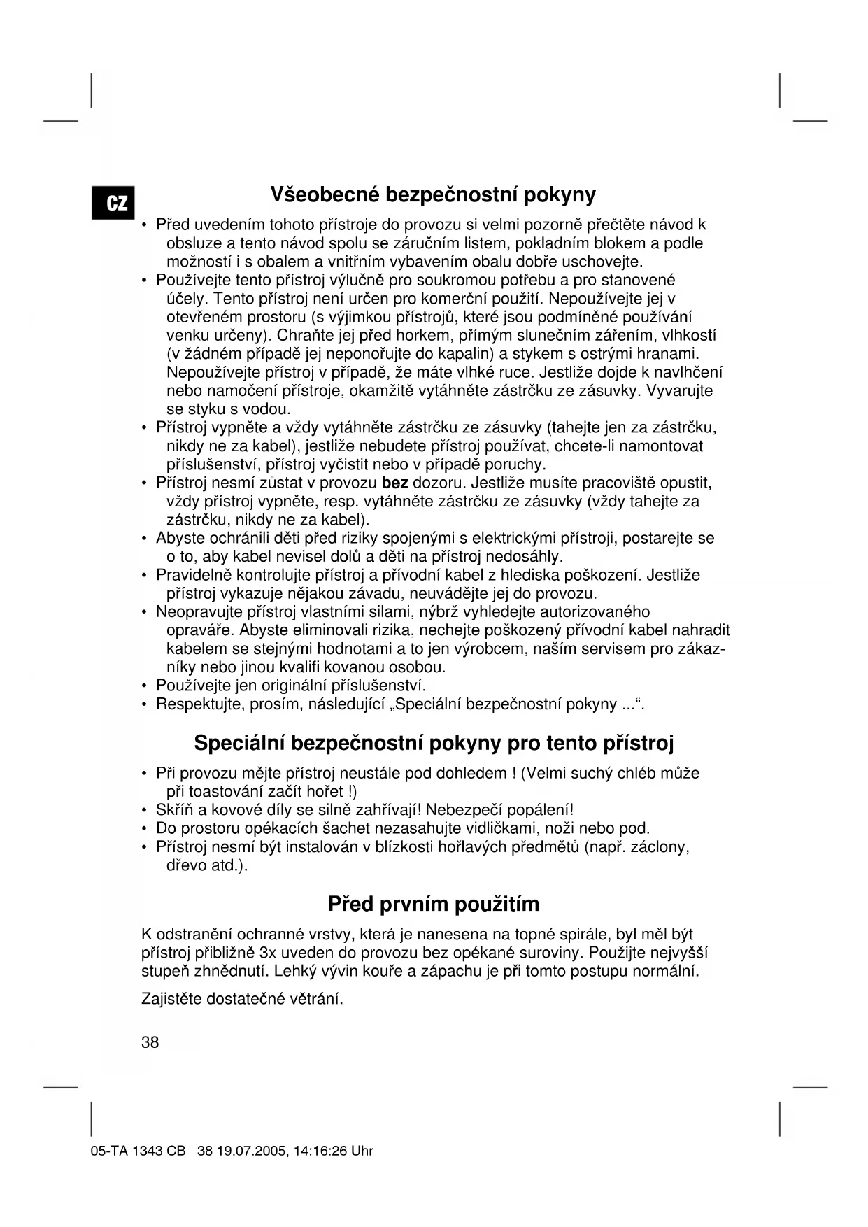 K odstraneni ochranné vrstvy, ktera je nanesena na topné spirále, byl měl byt prístroj príblízně 3x uveden do provozu bez opěkané suroviny. Použijte nejvyšsī stupeč zhnědnutí. Lehký vyvin kouře a zápachu je pri totom postupu normalní.