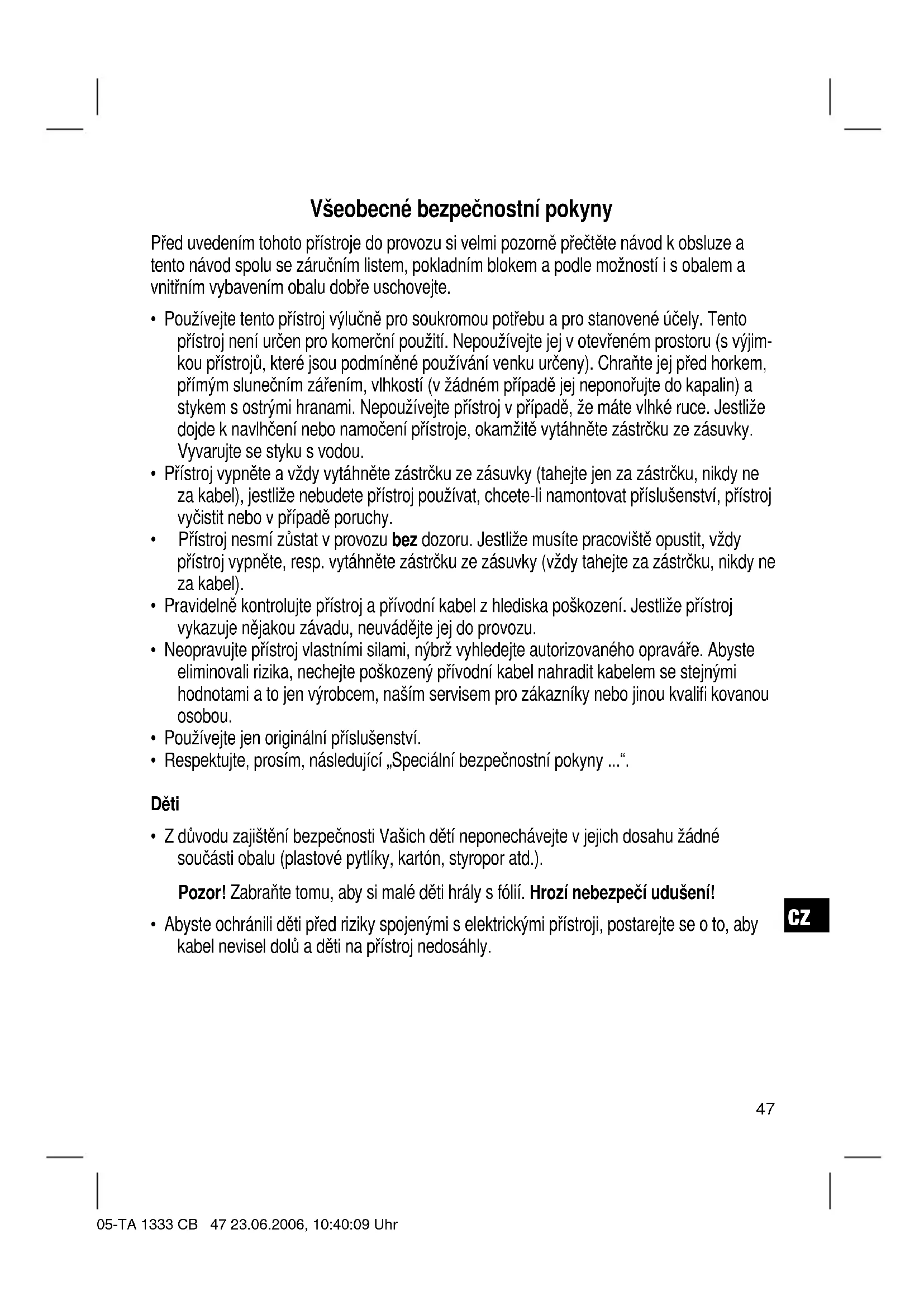 - Prístroj vypněte a vždy vytáhněte zástrčku ze zásuvky (tahejte Jen za zástrčku, nikdy ne za kabel), jestlíze nebudete prístroj používat, chcete-li namontovat príslušenství, prístroj včistit nebo v pripadě poruchy.