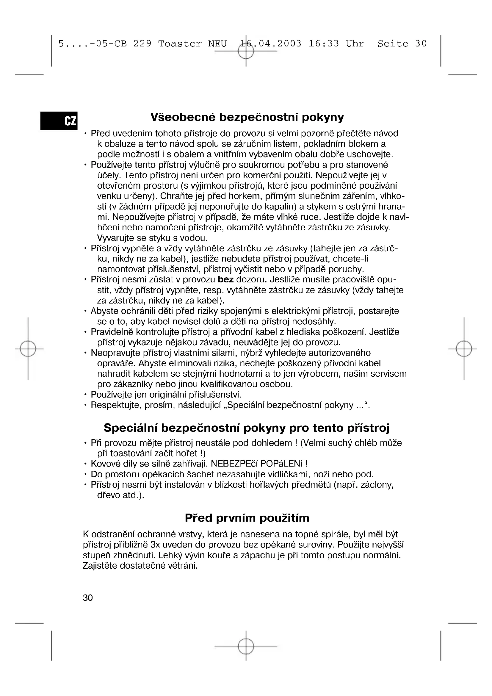 K odstranění ochranné vrstvy, která je nanesena na topné spirále, byl měl být přístroj přibližně 3x uveden do provozu bez opékané suroviny. Použijte nejvyšší stupeň zhnědnutí. Lehký vývin kouře a zápachu je při tomto postupu normální. Zajistěte dostatečné větrání.