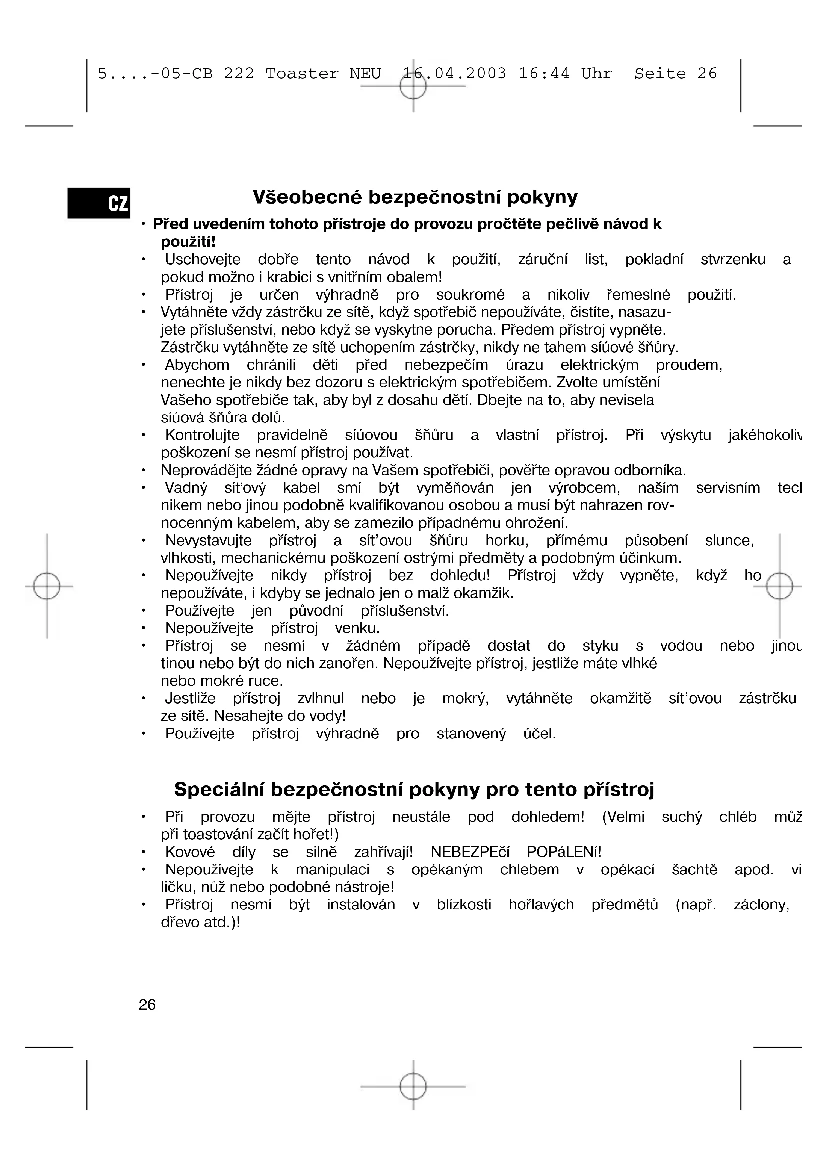 5....-05-CB 222 Toaster NEU 16.04.2003 16:44 Uhr Seite 27Tento přístroj odpovídá směrnicím Evropské společnosti pro odrušení a nízkovoltovou bezpečnost a je sestaven podle nejnovějších předpisů bezpeč- nostní techniky. Vyhrazujeme si technické změny! Záruka Na námí prodávaný přistroj poskytujeme záruku 24 mésíců ode dne prodeje (pokladní doklad). Po dobu trvání záruční doby odstraníme bezplatné závady přístroje, které vzni- knou v důsledku výrobních či materiálových vad, a to bud'to formou opravy nebo výměnou. Jako záruční list platí doklad o koupi. Bez tohoto dokladu nemůže být výměna nebo oprava bezplatně provedena. V případě spadajícím do záruky odevzdejte plný přístroj v originálním obalu a s pokladním dokladem Vašemu odchodníkovi. Poškození skla nebo závady na příslušenství nejsou důvodem k výměně přístro- je, ale tyto díly budou bezplatně vyměněny. V tomto případé nezasílejte celý přístroje, ale objednejte si pouze poškozenou součást příslušenství! Čištění, údržba nebo výměna opotřebovaných částí nespadají do rozsahu zéruky a budou proto provedeny jen oproti úhradě. Zéruka zaniká v případě neoprávněněho zásahu do přístroje. Po uplynutí záruky Po uplynutí záuční doby mohou být opravy prováděny příslušným obchodem nebo servisem jen za úhradu.