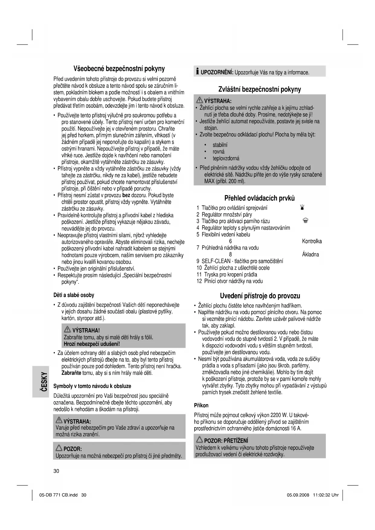 Vzhledem k velkému výkonu tohoto přístroje nepoužívejte prodlužovací vedení či elektrické rozdvojky. 05-DB 771 CB.indd 3005-DB 771 CB.indd 30 05.09.2008 11:02:32 Uhr05.09.2008 11:02:32 Uhr31 ČESKY ČESKY Používání žehličky UPOZORNĚNÍ: S tímto spotřebičem žehlete pouze oděvy a textilie!