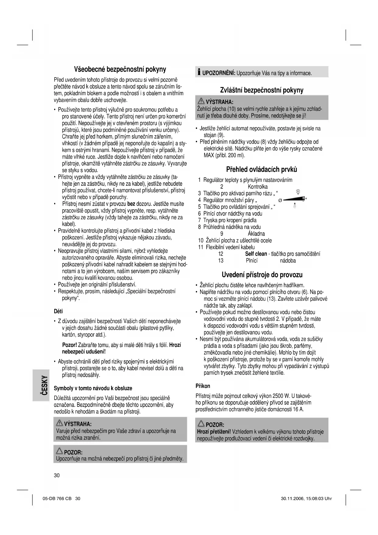 - Nesmí být používána akumulátorová voda, voda ze sušičky prádla a voda s přísadami (jako jsou škrob, parfémy, změkčovadla nebo jiné chemikálie). Mohlo by tím dojít k poškození přístroje, protože by se v parní komoře mohly vytvářet zbytky. Tyto zbytky mohou při vypadávání z výstupů parních trysek znečistit žehlené textilie. Příkon Přístroj může pojmout celkový výkon 2500 W. U takové- ho příkonu se doporučuje oddělený přívod se zajištěním prostřednictvím ochranného jističe domácnosti 16 A. POZOR: Hrozí přetížení! Vzhledem k velkému výkonu tohoto přístroje nepoužívejte prodlužovací vedení či elektrické rozdvojky. 05-DB 766 CB 30 30.11.2006, 15:08:03 UhrČESKY