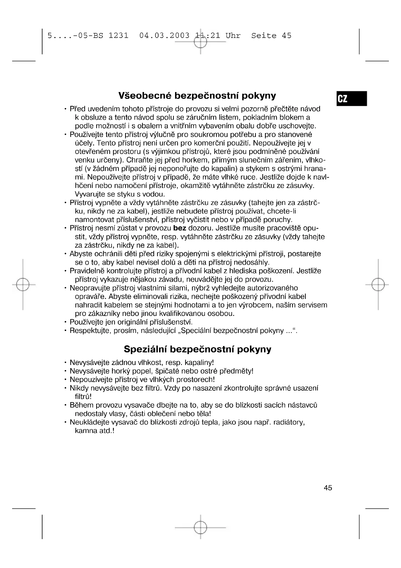 5....-05-BS 1231 04.03.2003 11:21 Uhr Seite 48Jako záruční doklad slouží doklad o koupi. Bez tohoto dokladu nelze uskutečnit bezplatnou výměnu nebo bezplatnou opravu. V případě uplatnění záruky předejte, prosím, kompletní přístroj v originálním obalu spolu s pokladním dokladem Vašemu obchodníkovi. *) Poškození příslušenství není automaticky důvodem pro bezplatnou výměnu kompletního přístroje. V takovém případě se obraťte na naši Hotline! Prasklé skleněné resp. plastové díly zásadně podléhají povinnosti úhrady! Jak na vady na spotřebním příslušenství, resp. dílech podléhajících rychlému opotřebení (např. uhlíky motoru, hnětací háky, hnací řemeny, náhradní dálkové ovládání, náhradní zubní kartáčky, pilové listy atd.), tak i na čištění, údržbu nebo výměnu dílů podléhajících rychlému opotřebení se záruka nevztahuje a je proto nutno je uhradit! Záruka zaniká v případě, že dojde k zásahu neautorizovanou osobou. Po uplynutí záruky Po uplynutí záruční doby je možno za úplatu provést opravy v příslušném odborném obchodě nebo opravně.