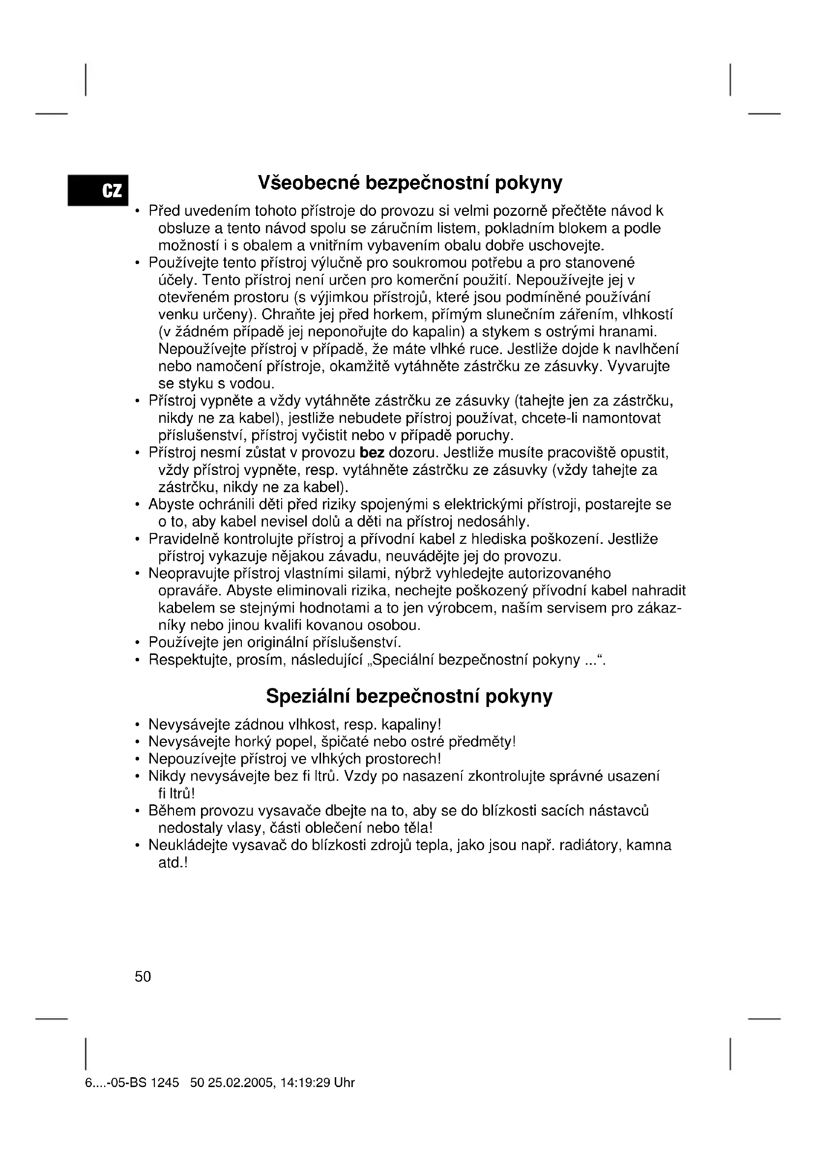 - Neukládejte vysavač do blízkosti zdrojů tepla, jako jsou např. radiátory, kamna atd.! 6....-05-BS 1245 50 25.02.2005, 14:19:29 UhrCZ