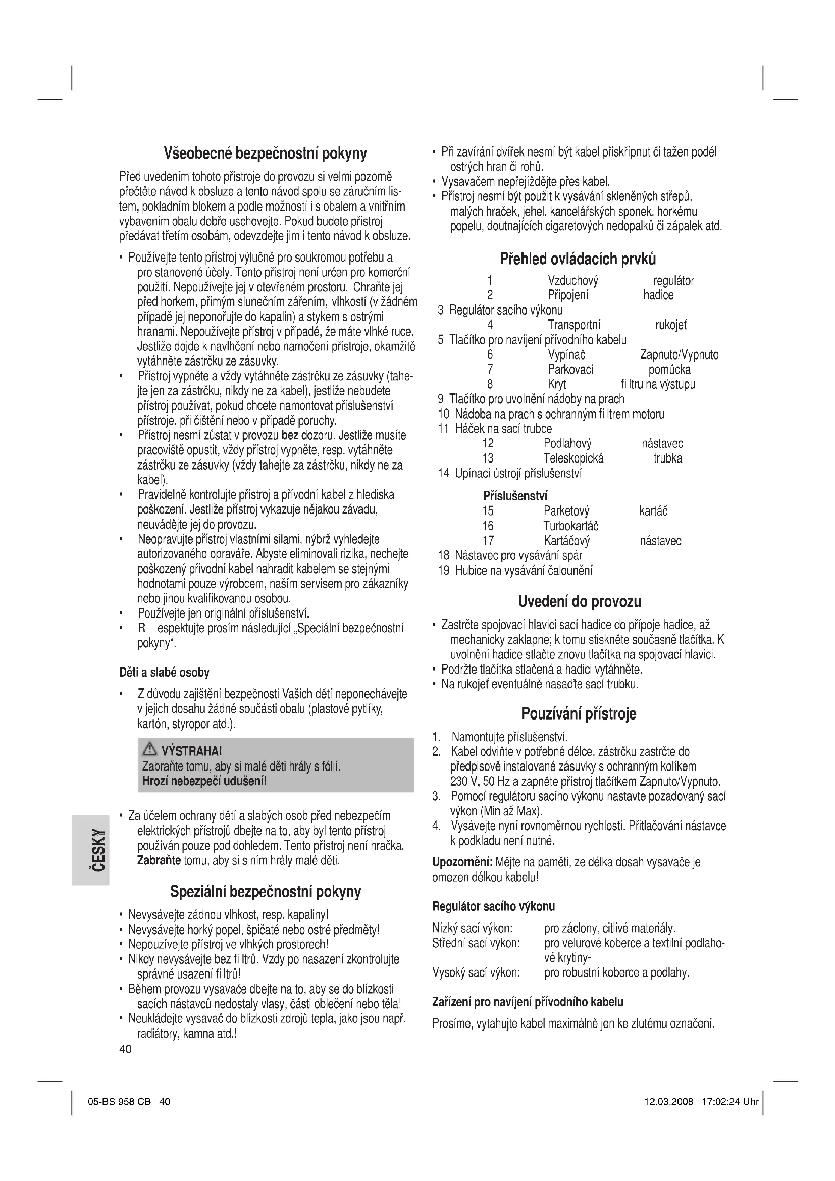 k podkladu není nutné. Upozornění: Mějte na paměti, ze délka dosah vysavače je omezen délkou kabelu! Regulátor sacího výkonu Nízký sací výkon: pro záclony, citlivé materiály. Střední sací výkon: pro velurové koberce a textilní podlaho- vé krytiny- Vysoký sací výkon: pro robustní koberce a podlahy. Zařízení pro navíjení přívodního kabelu Prosíme, vytahujte kabel maximálně jen ke zlutému označení. 05-BS 1273.indd 4005-BS 958 CB 40 07.03.2008 8:24:50 Uhr12.03.2008 17:02:24 Uhr41 ČESKY ČESKY Nevytahujte kabel v zádném případě az k červenému označení, protoze by mohlo dojít k poškození samonavíjecího zařízení. Takovéto závady pak nespadají do záručního plnění. Navíjení Stiskněte tlačítko pro navíjení kabelu a “doveďte” kabel az do tělesa přístroje. Drzte jej pevně, aby nedošlo k nezádoucímu úderu do přístroje. Teleskopická sací trubice Výšková přestavitelnost sací trubice umožňuje její individuální přizpůsobení Vaší tělesné výšce. Odjistěte spojku stlačením tlačítka ve směru šipky. Nastavte délku sací trubice podle potřeby. K opětovnému zajištění tlačítko uvolněte, až slyšitelně zaklapne. Nástavce Nástavec pro vysávání spár, kartáčový nástavec: K vysávání čalounění, záclon a v rozích a štěrbinách. Hubice na vysávání čalounění: K čištění čalounění, záclon atd. Podlahový nástavec: K čištění koberců nebo hladkých ploch. Hladká podlaha: Stlačte páku se symbolem kartáče