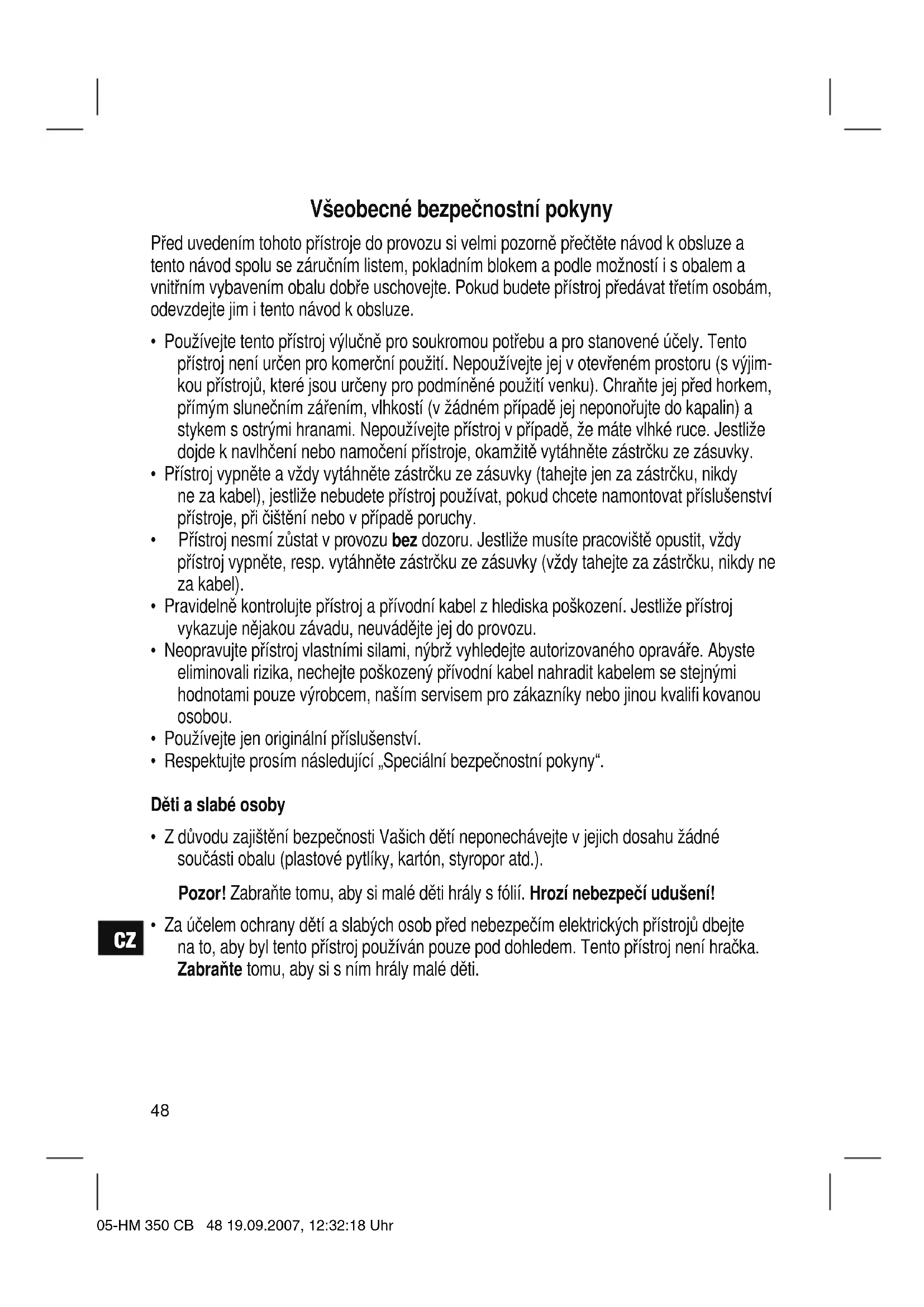 - Za účelem ochrany dětí a slabých osob před nebezpečím elektrických přístrojů dbejte na to, aby byl tento přístroj používán pouze pod dohledem. Tento přístroj není hračka. Zabraňte tomu, aby si s ním hrály malé děti. 05-HM 350 CB 48 19.09.2007, 12:32:18 UhrCZ