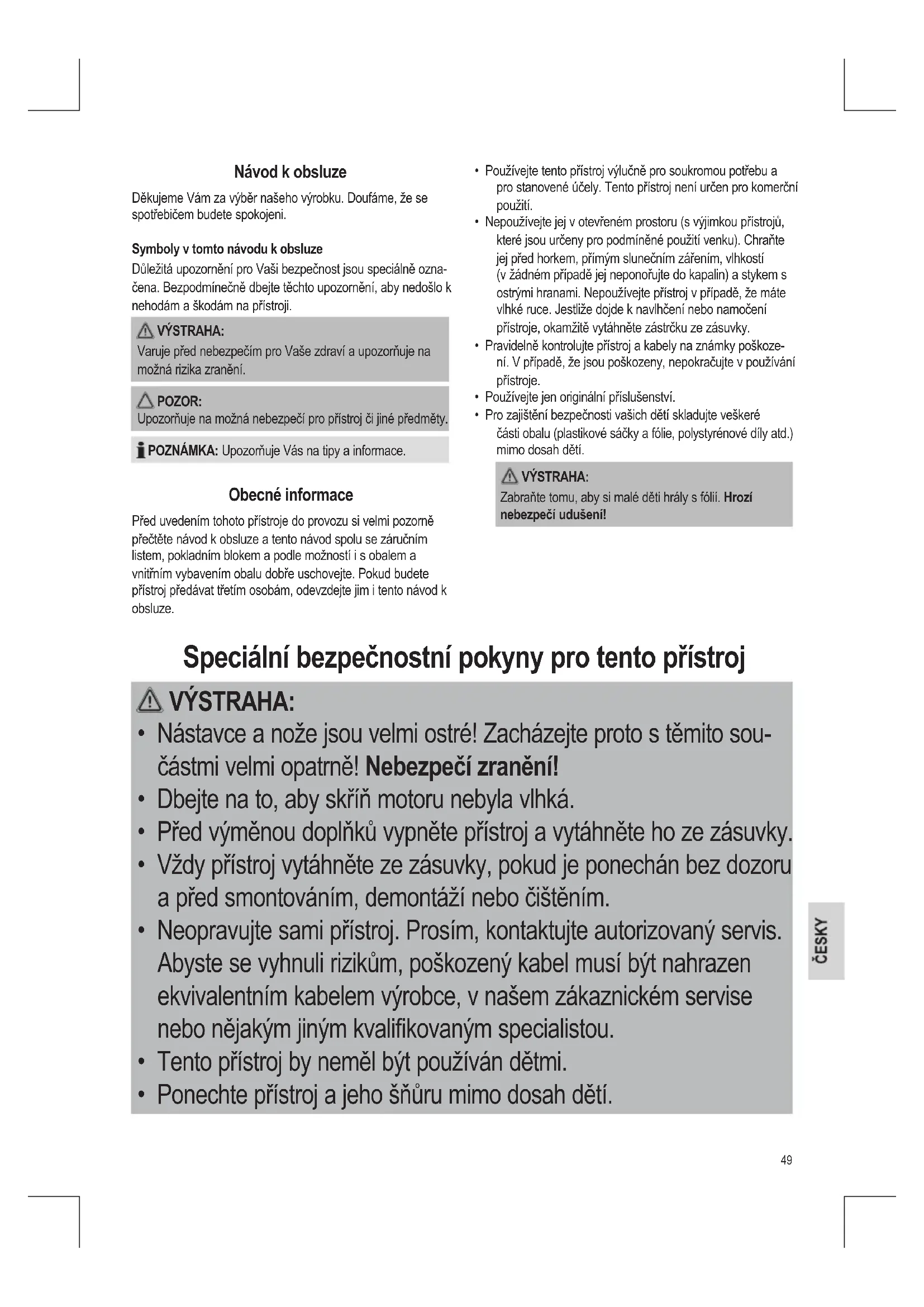 - Pro zajištění bezpečnosti vašich dětí skladujte veškeré části obalu (plastikové sáčky a fólie, polystyrénové díly atd.) mimo dosah dětí. VÝSTRAHA: Zabraňte tomu, aby si malé děti hrály s fólií. Hrozí nebezpečí udušení! Návod k obsluze Děkujeme Vám za výběr našeho výrobku. Doufáme, že se spotřebičem budete spokojeni. Symboly v tomto návodu k obsluze Důležitá upozornění pro Vaši bezpečnost jsou speciálně ozna- čena. Bezpodmínečně dbejte těchto upozornění, aby nedošlo k nehodám a škodám na přístroji. VÝSTRAHA: Varuje před nebezpečím pro Vaše zdraví a upozorňuje na možná rizika zranění. POZOR: Upozorňuje na možná nebezpečí pro přístroj či jiné předměty. POZNÁMKA: Upozorňuje Vás na tipy a informace. Obecné informace Před uvedením tohoto přístroje do provozu si velmi pozorně přečtěte návod k obsluze a tento návod spolu se záručním listem, pokladním blokem a podle možností i s obalem a vnitřním vybavením obalu dobře uschovejte. Pokud budete přístroj předávat třetím osobám, odevzdejte jim i tento návod k obsluze. Speciální bezpečnostní pokyny pro tento přístroj VÝSTRAHA: