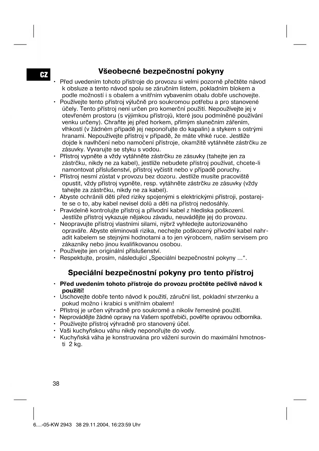 - Kuchyňská váha je konstruována pro vážení surovin do maximální hmotnos- ti 2 kg. 6....-05-KW 2943 38 29.11.2004, 16:23:59 UhrCZ