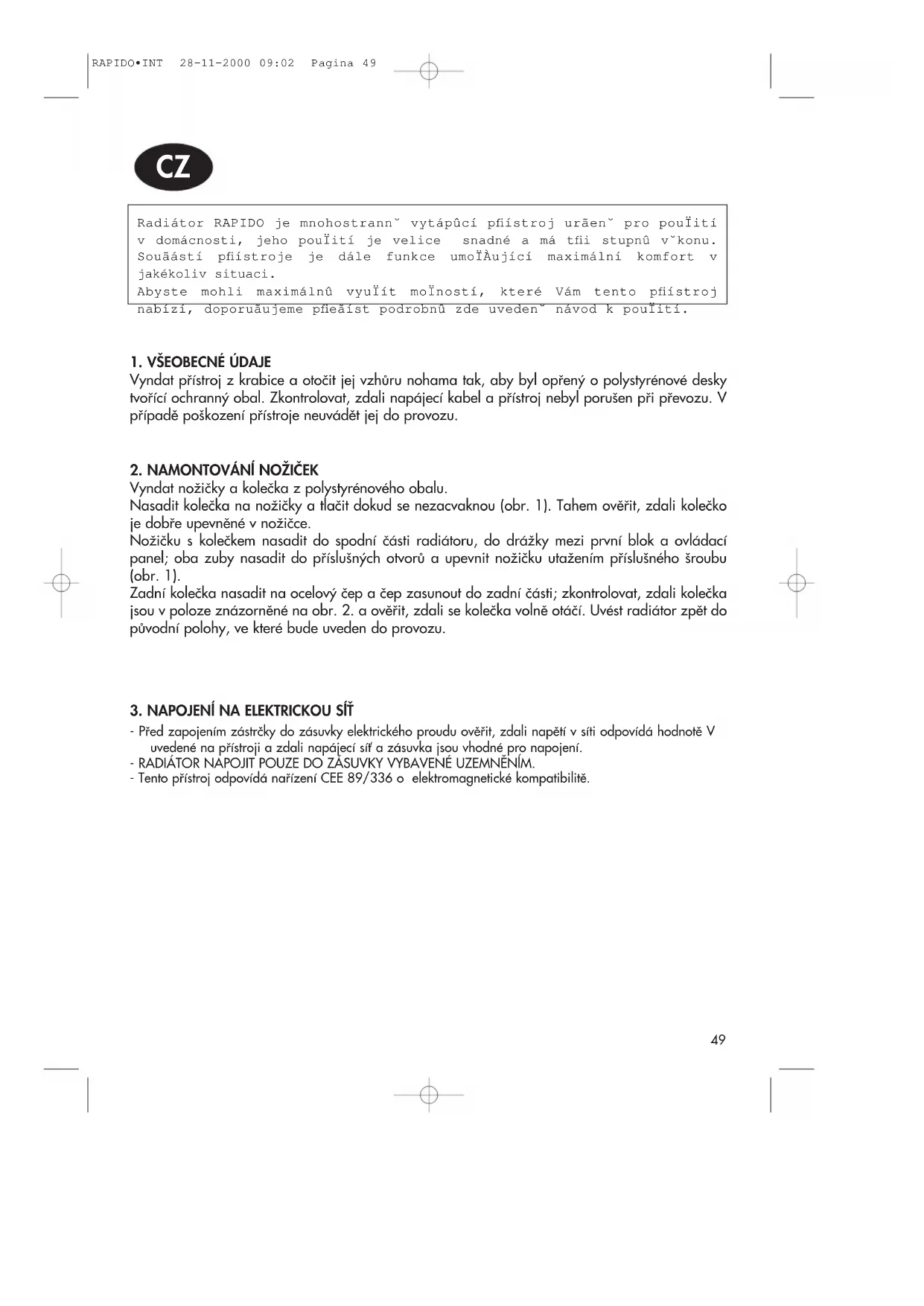 RAPIDO•INT 28-11-2000 09:02 Pagina 4849 Radiátor RAPIDO je mnohostrann˘ vytápûcí pfiístroj urãen˘ pro pouÏití v domácnosti, jeho pouÏití je velice snadné a má tfii stupnû v˘konu. Souãástí pfiístroje je dále funkce umoÏÀující maximální komfort v jakékoliv situaci. Abyste mohli maximálnû vyuÏít moÏností, které Vám tento pfiístroj nabízí, doporuãujeme pfieãíst podrobnû zde uveden˘ návod k pouÏití.