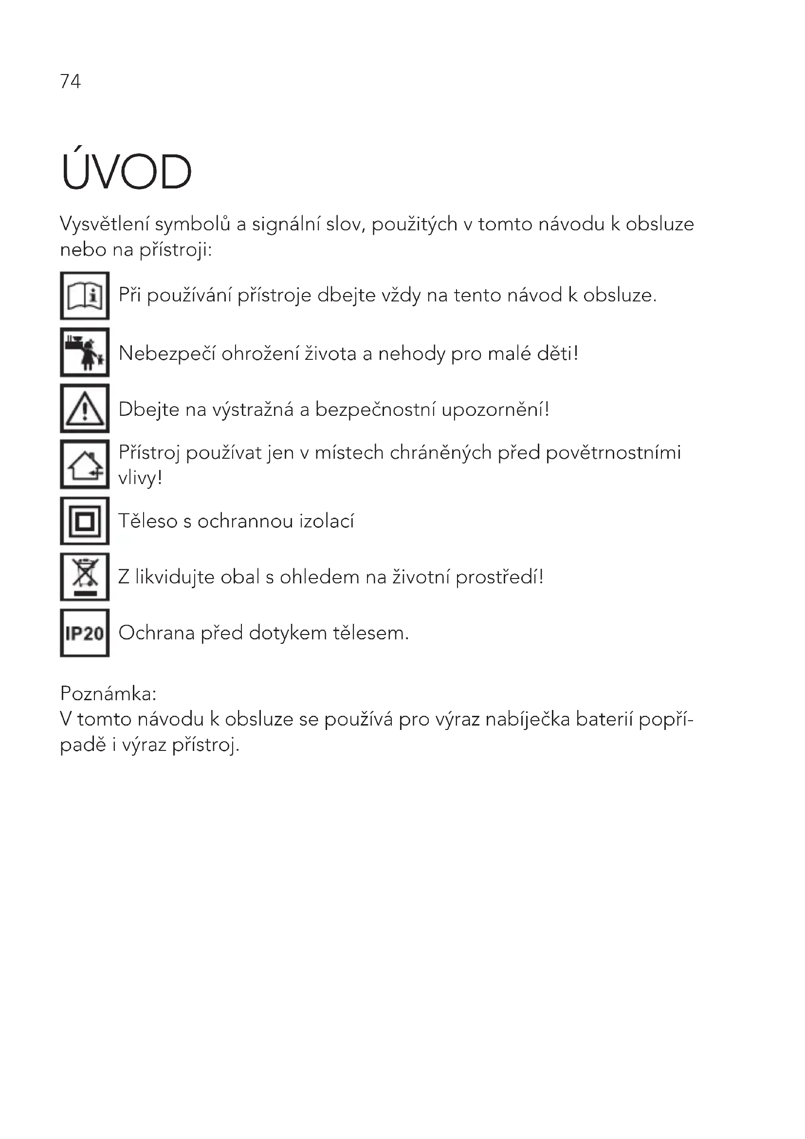 - Likvidace CZ74 ÚvOd Vysvětlení symbolů a signální slov, použitých v tomto návodu k obsluze nebo na přístroji: Při používání přístroje dbejte vždy na tento návod k obsluze. Nebezpečí ohrožení života a nehody pro malé děti! Dbejte na výstražná a bezpečnostní upozornění! Přístroj používat jen v místech chráněných před povětrnostními vlivy! Těleso s ochrannou izolací Z likvidujte obal s ohledem na životní prostředí! Ochrana před dotykem tělesem. Poznámka: V tomto návodu k obsluze se používá pro výraz nabíječka baterií popří- padě i výraz přístroj.IT p. 90