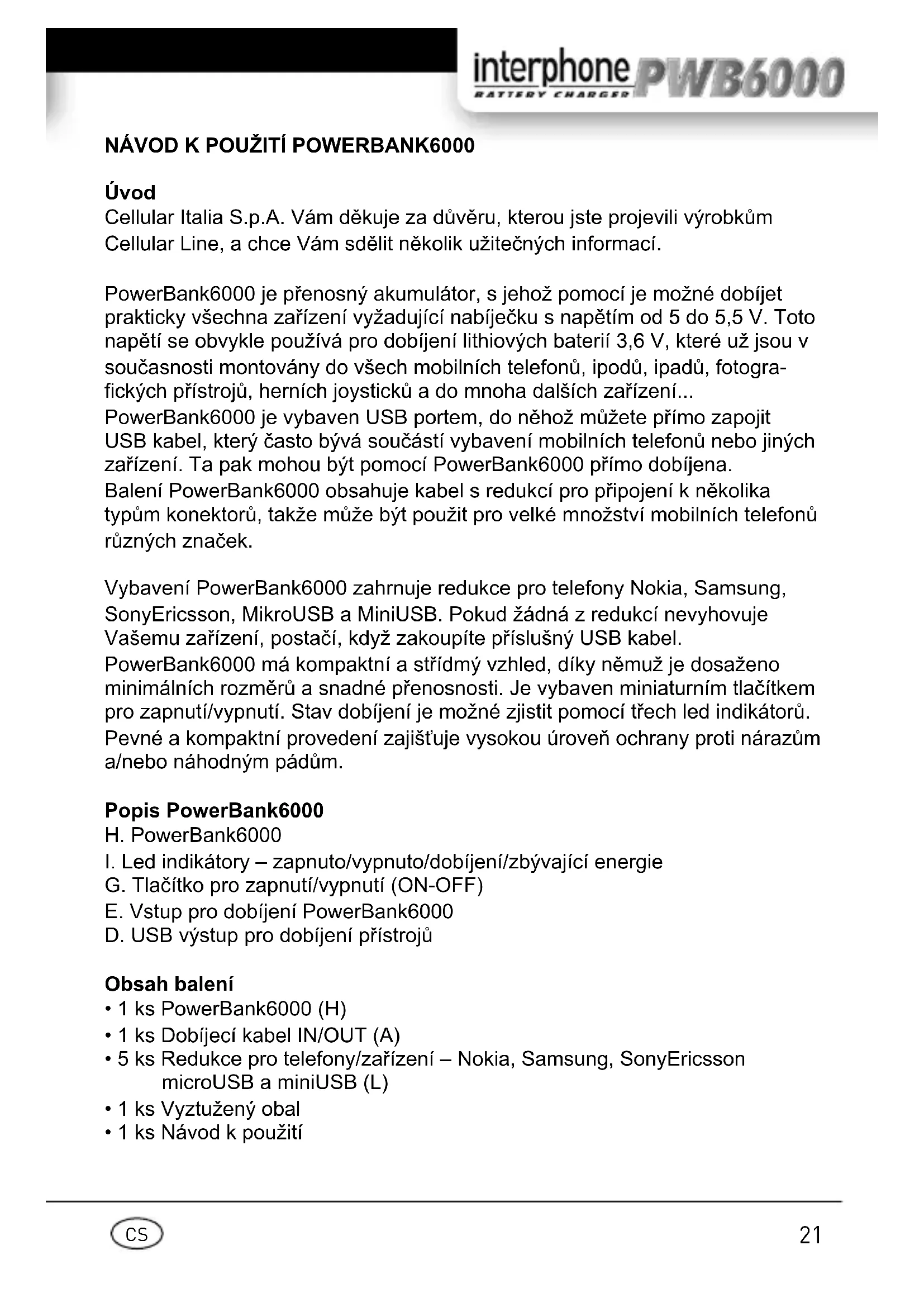 Interphone PWB6000 - Přenosná baterie Cellular Line - Bezplatný návod k obsluze
