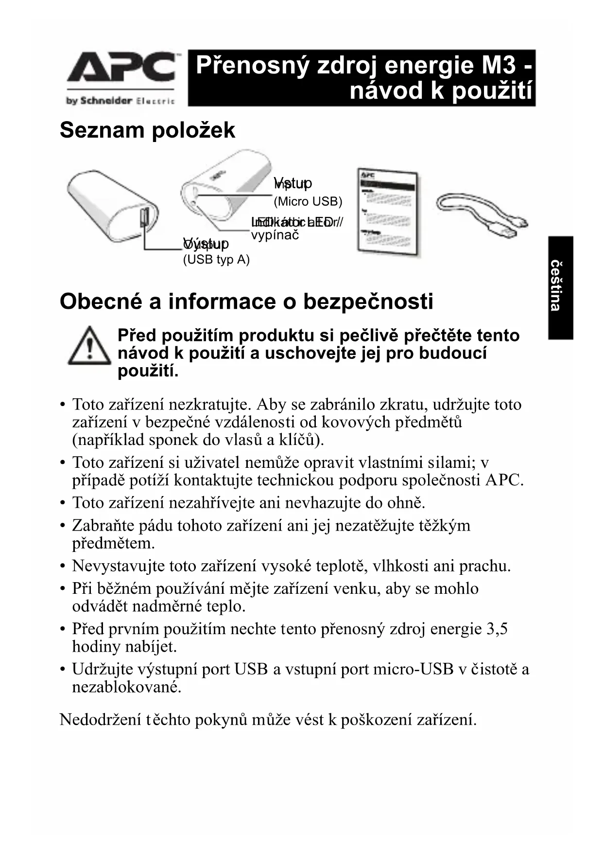 F)© 2015 APC by Schneider Electric. APC, a logo APC jsou majetkem společnosti Schneider Electric Industries S.A.S. nebo jejích sesterských společností. Všechny ostatní ochranné známky jsou majetkem příslušných vlastníků. CS 990-5593 01/2015 čeština Odstraňování závad Celosvětová zákaznická podpora společnosti APC by Schneider Electric Informace o zákaznické podpoře pro konkrétní země najdete na webových stránkách společnosti APC by Schneider Electric na adrese www.apc.com. Problém / možná příčina Řešení Přenosný zdroj energie pro mobilní zařízení nelze nabít Nabíječka USB pravděpodobně nefunguje správně nebo se počítač nachází v režimu spánku. Vyzkoušejte jinou nabíječku USB nebo probuďte počítač z režimu spánku. Kabel micro USB a kontakty konektorů jsou opotřebované. Zkuste použít nový konektor micro USB Přenosný zdroj energie nenabíjí některá zařízení. Přenosný zdroj energie pravděpodobně nerozpoznal a nedetekoval připojená zařízení. Některé náhradní kabely USB nemusí s bateriovým zdrojem M3 fungovat správně. Chcete-li tento problém vyřešit, stisknutím vypínače na zdroji M3 spusťte nabíjení zařízení. Pokud bateriový zdroj i přesto nebude zařízení nabíjet, místo náhradního kabelu použijte pů vodní kabel dodaný se zařízením. Došlo k přetížení a bliká oranžový indikátor LED zdroje M3. Zdroj M3 nabíjí zařízení a jeho výstupní proud USB překračuje stanovený rozsah. Odpojte napájené zařízení od zdroje energie M3. Skončila životnost přenosného zdroje energie nebo došlo k jeho závadě. V případě závady systému kontaktujte nejbližšího prodejce APC by Schneider Electric nebo autorizovaný servis APC by Schneider Electric.ελληνικά Περιεχόμενο της συσκευασίας Γενικές πληροφορίες και πληροφορίες για την ασφάλεια Διαβάστε προσεκτικά αυτό το εγχειρίδιο χρήστη πριν χρησιμοποιήσετε το προϊόν και φυλάξτε το για μελλοντική αναφορά.