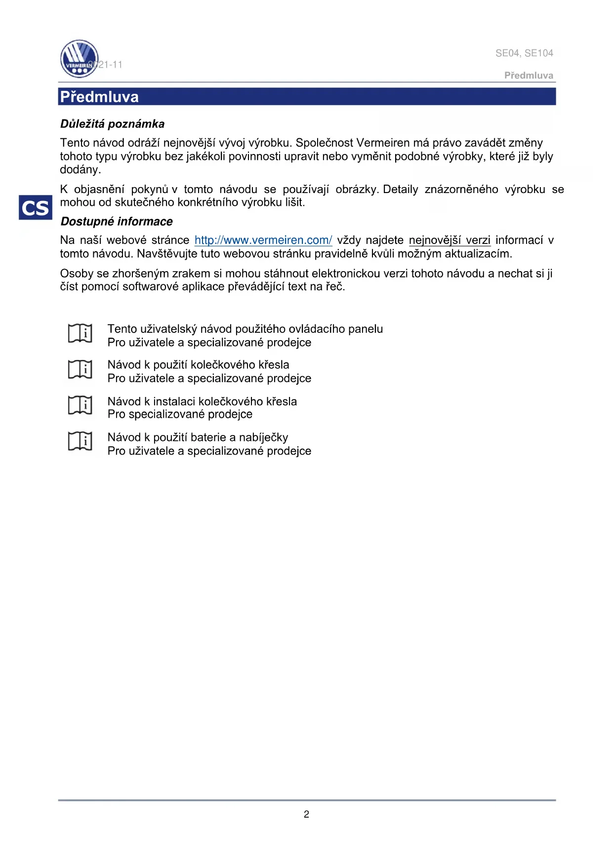 Předmluva Důležitá poznámka Tento návod odráží nejnovější vývoj výrobku. Společnost Vermeiren má právo zavádět změny tohoto typu výrobku bez jakékoli povinnosti upravit nebo vyměnit podobné výrobky, které již byly dodány. K objasnění pokynů v tomto návodu se používají obrázky. Detaily znázorněného výrobku se mohou od skutečného konkrétního výrobku lišit. Dostupné informace Na naší webové stránce http://www.vermeiren.com/ vždy najdete nejnovější verzi informací v tomto návodu. Navštěvujte tuto webovou stránku pravidelně kvůli možným aktualizacím. Osoby se zhoršeným zrakem si mohou stáhnout elektronickou verzi tohoto návodu a nechat si ji číst pomocí softwarové aplikace převádějící text na řeč.