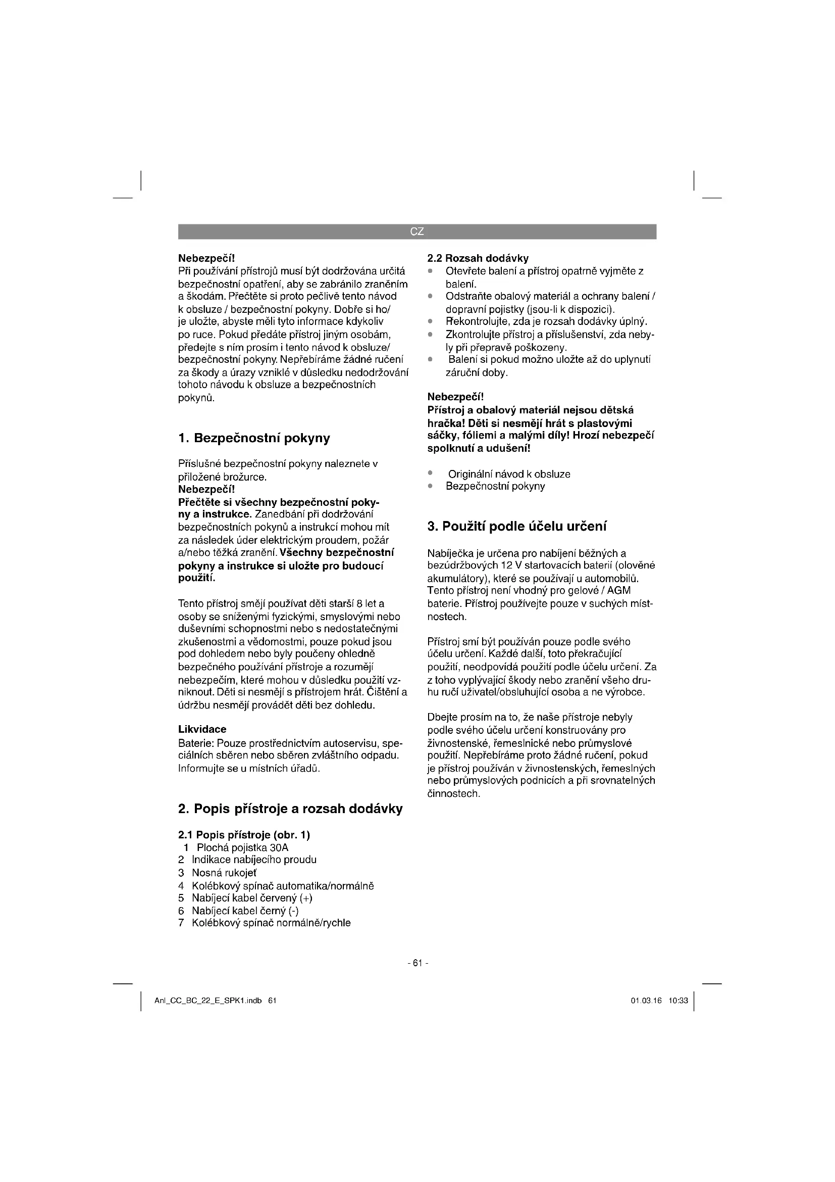 Nabíječka je určena pro nabíjení běžných a bezúdržbových 12 V startovacích baterií (olověné akumulátory), které se používají u automobilů. Tento přístroj není vhodný pro gelové / AGM baterie. Přístroj používejte pouze v suchých míst- nostech. Přístroj smí být používán pouze podle svého účelu určení. Každé další, toto překračující použití, neodpovídá použití podle účelu určení. Za z toho vyplývající škody nebo zranění všeho dru- hu ručí uživatel/obsluhující osoba a ne výrobce. Dbejte prosím na to, že naše přístroje nebyly podle svého účelu určení konstruovány pro živnostenské, řemeslnické nebo průmyslové použití. Nepřebíráme proto žádné ručení, pokud je přístroj používán v živnostenských, řemeslných nebo průmyslových podnicích a při srovnatelných činnostech. Anl_CC_BC_22_E_SPK1.indb 61Anl_CC_BC_22_E_SPK1.indb 61 01.03.16 10:3301.03.16 10:33CZ