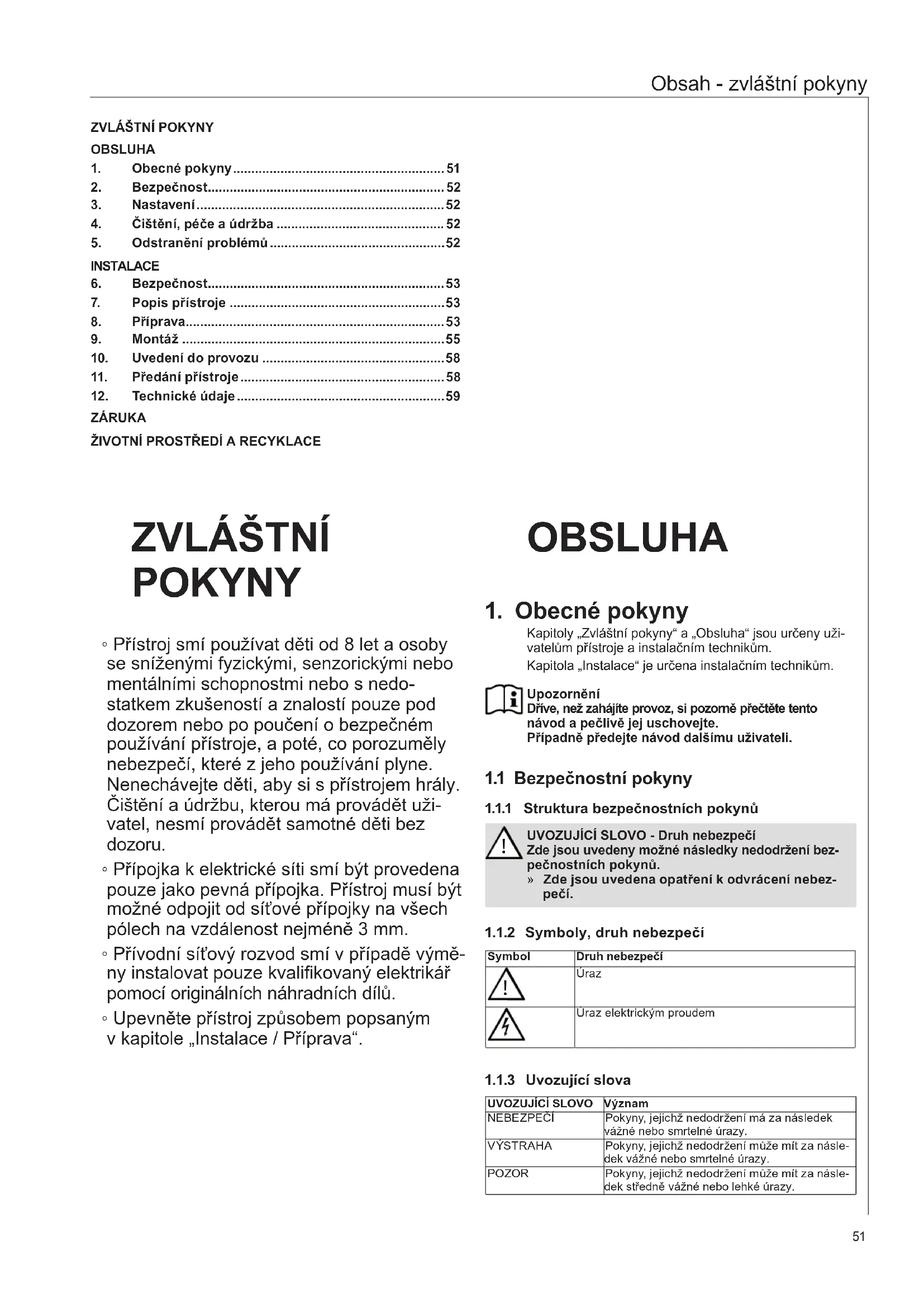 Kapitoly „Zvláštní pokyny“ a „Obsluha“ jsou určeny uži-vatelům přístroje a instalačním technikům.Kapitola „Instalace“ je určena instalačním technikům. UpozorněníDříve, než zahájíte provoz, si pozorně přečtěte tento návod a pečlivě jej uschovejte.Případně předejte návod dalšímu uživateli.1.1 Bezpečnostní pokyny1.1.1 Struktura bezpečnostních pokynů