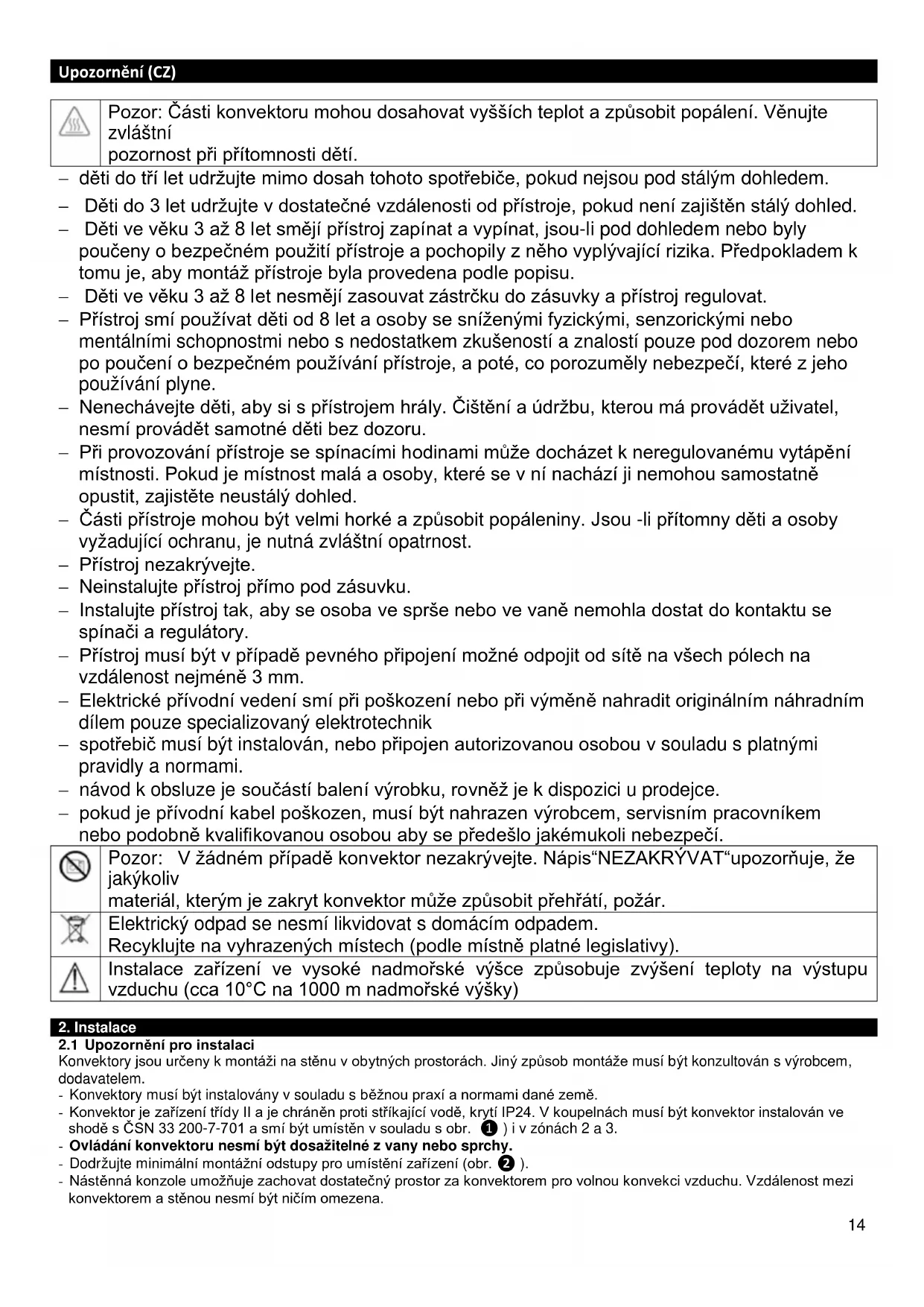 Pozor: Části konvektoru mohou dosahovat vyšších teplot a způsobit popálení. Věnujte zvláštní pozornost při přítomnosti dětí. − děti do tří let udržujte mimo dosah tohoto spotřebiče, pokud nejsou pod stálým dohledem. − Děti do 3 let udržujte v dostatečné vzdálenosti od přístroje, pokud není zajištěn stálý dohled. − Děti ve věku 3 až 8 let smějí přístroj zapínat a vypínat, jsou-li pod dohledem nebo byly poučeny o bezpečném použití přístroje a pochopily z něho vyplývající rizika. Předpokladem k tomu je, aby montáž přístroje byla provedena podle popisu. − Děti ve věku 3 až 8 let nesmějí zasouvat zástrčku do zásuvky a přístroj regulovat. − Přístroj smí používat děti od 8 let a osoby se sníženými fyzickými, senzorickými nebo mentálními schopnostmi nebo s nedostatkem zkušeností a znalostí pouze pod dozorem nebo po poučení o bezpečném používání přístroje, a poté, co porozuměly nebezpečí, které z jeho používání plyne. − Nenechávejte děti, aby si s přístrojem hrály. Čištění a údržbu, kterou má provádět uživatel, nesmí provádět samotné děti bez dozoru. − Při provozování přístroje se spínacími hodinami může docházet k neregulovanému vytápění místnosti. Pokud je místnost malá a osoby, které se v ní nachází ji nemohou samostatně opustit, zajistěte neustálý dohled. − Části přístroje mohou být velmi horké a způsobit popáleniny. Jsou -li přítomny děti a osoby vyžadující ochranu, je nutná zvláštní opatrnost. − Přístroj nezakrývejte. − Neinstalujte přístroj přímo pod zásuvku. − Instalujte přístroj tak, aby se osoba ve sprše nebo ve vaně nemohla dostat do kontaktu se spínači a regulátory. − Přístroj musí být v případě pevného připojení možné odpojit od sítě na všech pólech na vzdálenost nejméně 3 mm. − Elektrické přívodní vedení smí při poškození nebo při výměně nahradit originálním náhradním dílem pouze specializovaný elektrotechnik − spotřebič musí být instalován, nebo připojen autorizovanou osobou v souladu s platnými pravidly a normami. − návod k obsluze je součástí balení výrobku, rovněž je k dispozici u prodejce. − pokud je přívodní kabel poškozen, musí být nahrazen výrobcem, servisním pracovníkem nebo podobně kvalifikovanou osobou aby se předešlo jakémukoli nebezpečí.