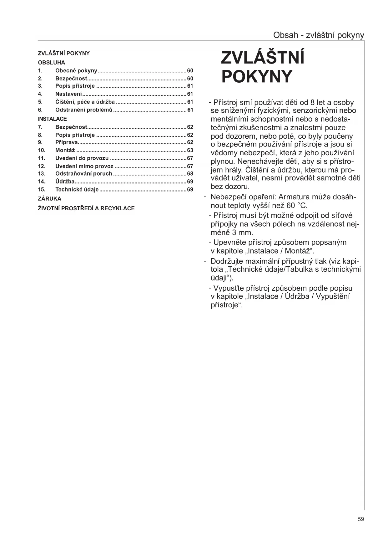 Kapitoly Zvlastni Pokyny a "Obluha"jsou urceny uzivatelum pristroje a instalacnim technikum.
